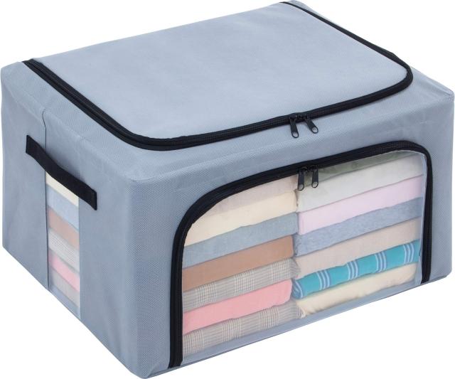 【特長】 ●積み重ねて使うことができる丈夫なワイヤー入りの大きめサイズの収納ケース。 ●3か所のワイヤーと底板入りでしっかりとしたつくりなので、ケースの形状をキープ。 ●前面と上面の2か所に3方向のダブルファスナーがあり、どちらからでも中身が取り出せる。 ●使わないときは、ワイヤーを折りたたむとコンパクトになるので場所を取らずにしまえる。 ●両サイドに持ち手が付いているので、重たい荷物を動かす際や片付けもラクラク。 ●前面に透明窓、側面にネームホルダー付きでケースを開けずに中身が分かり管理しやすい。 ●掛け布団、Tシャツ、長袖シャツ、セーター、ズボンなど様々なものの収納にオススメ。