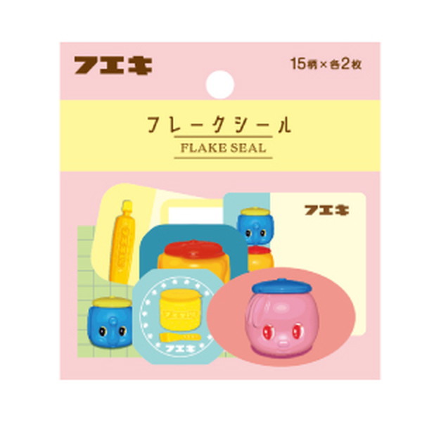 ●フエキの「のり」がデザインされたフレークシールです♪どうぶつのり、チューブのり、つぼのりなどのデザインが15種類×2枚入ったフレークシール!実写風デザインです。