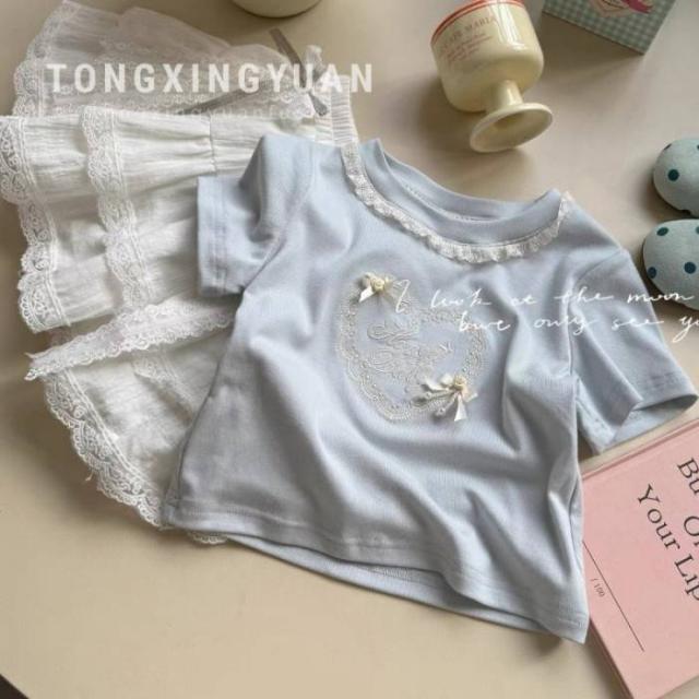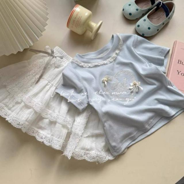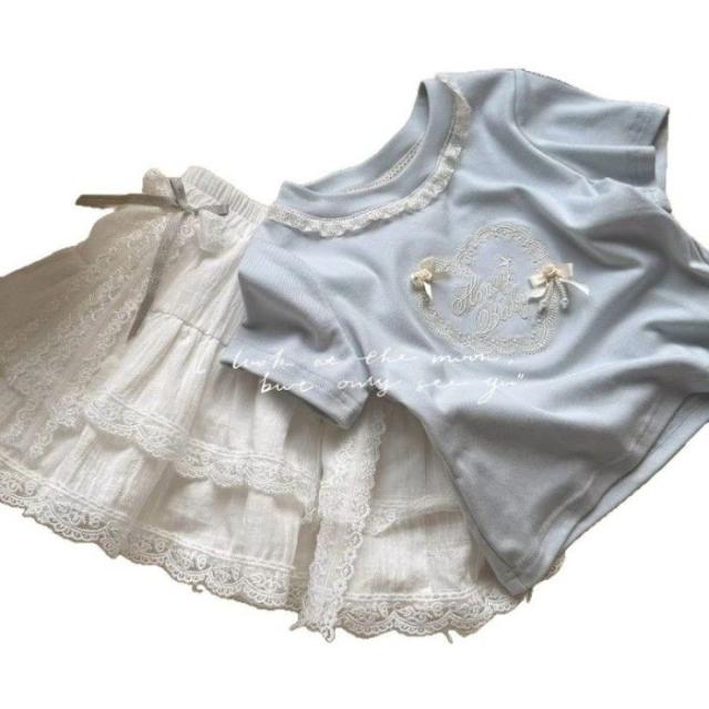 女の子 キッズ服 子供服 tシャツ スカート ブルー 刺?花柄 カジュアル 2点セット お出掛け 春夏 新作 可愛い 新品 韓国風 1-6歳