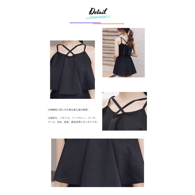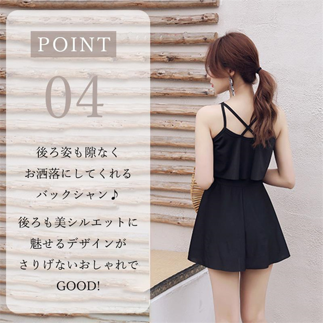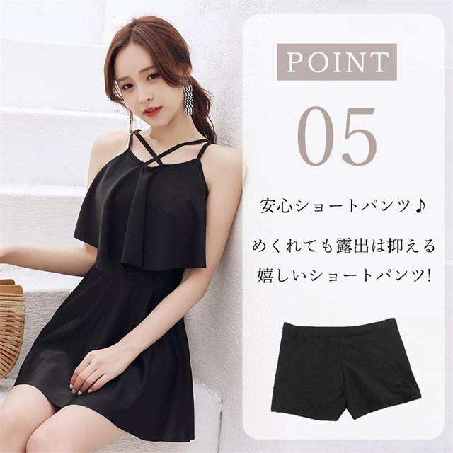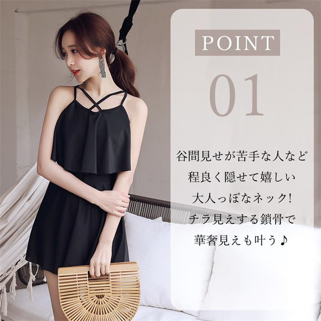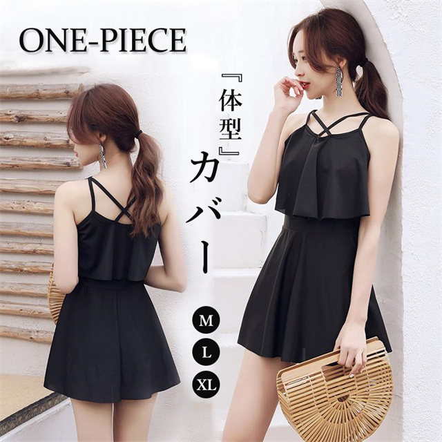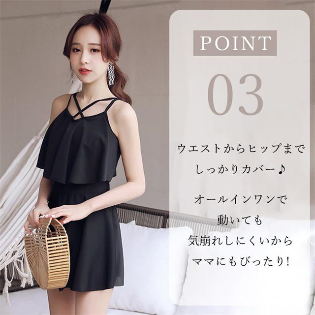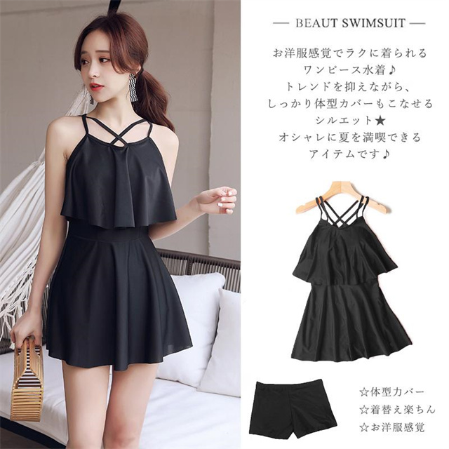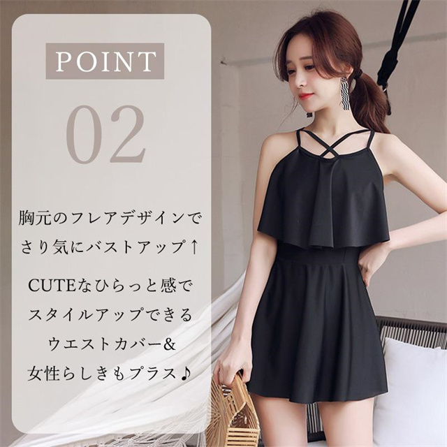 水着 レディース ワンピース オールインワン 体型カバー おしゃれ かわいい 20代 40代 肩出し アシメ 黒 無地 フリルヘム オトナ女子 フレアスカート お洒落 送料無料