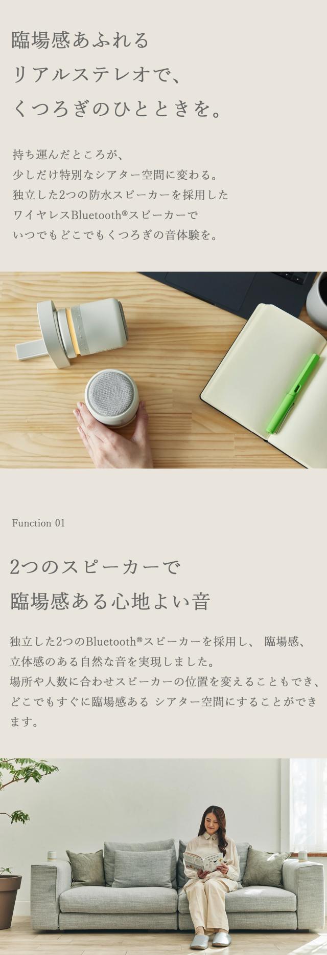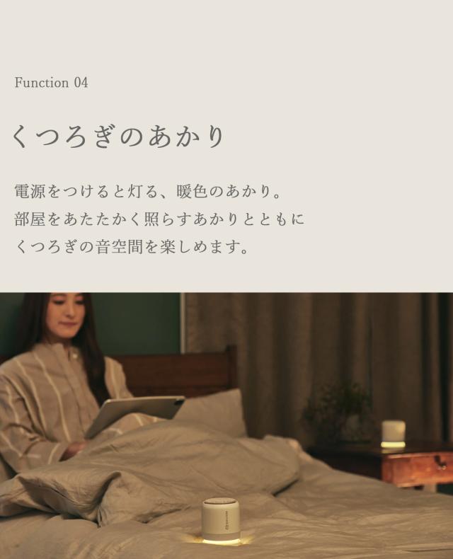 また、電源を入れるとやさしく灯るあかりは、間接照明のように空間をあたたかく照らし、音と光の両方からくつろぎをサポートしてくれます。