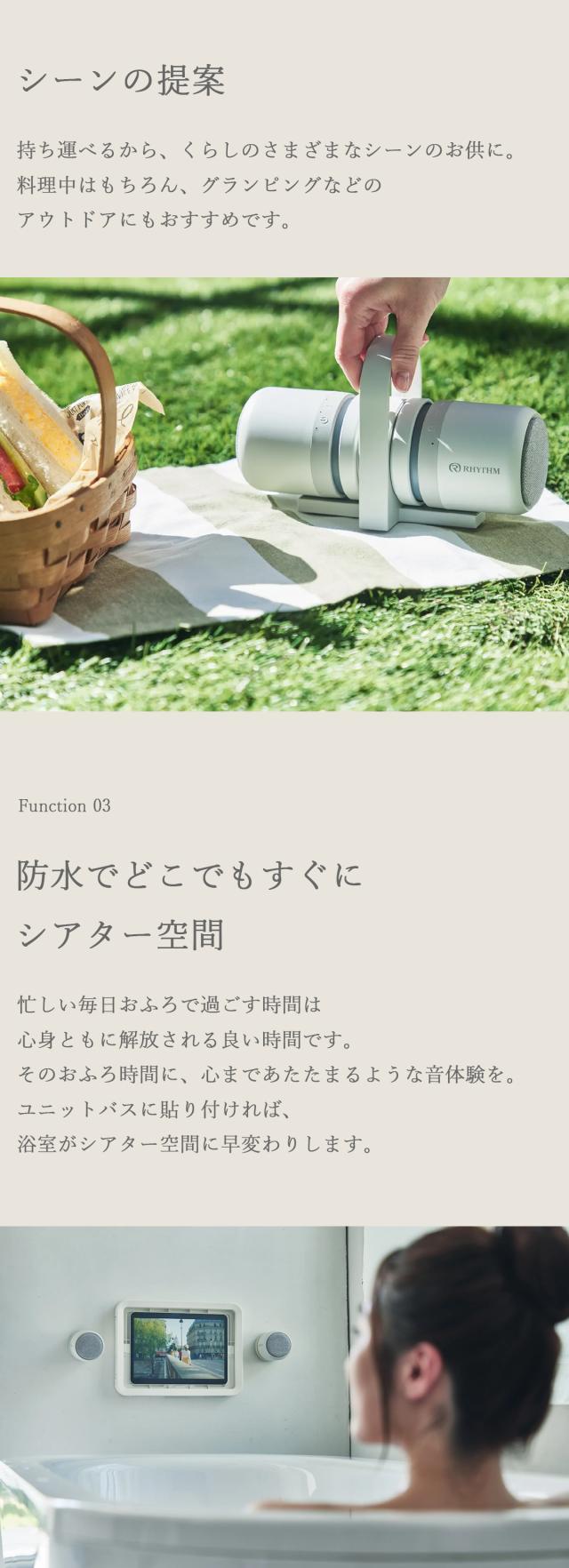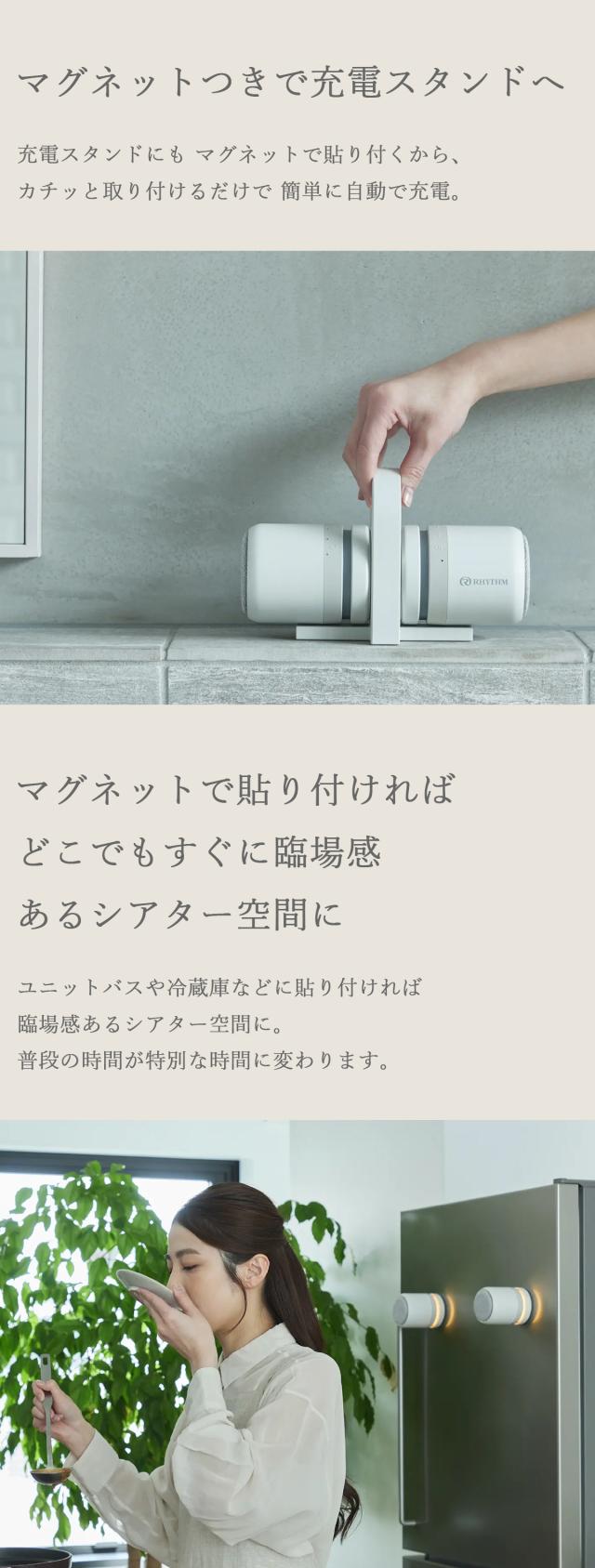 独立した左右2つのスピーカーを採用することで、立体感のあるサウンドを実現し、どこでも臨場感あるシアター空間に早変わりするステレオの防水ポータブルシアタースピーカーです。スピーカー底面部にはマグネットを搭載。充電スタンドにスマートに取り付けられ、簡単に充電可能です。ユニットバスの壁や冷蔵庫などに貼り付けて楽しむこともできます。さまざまなシーンでくつろぎの時間をお過ごしください。