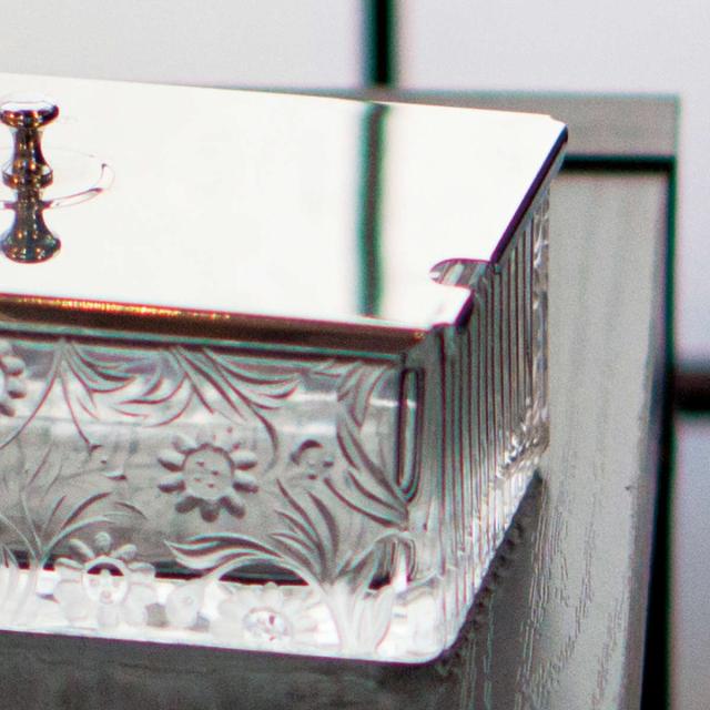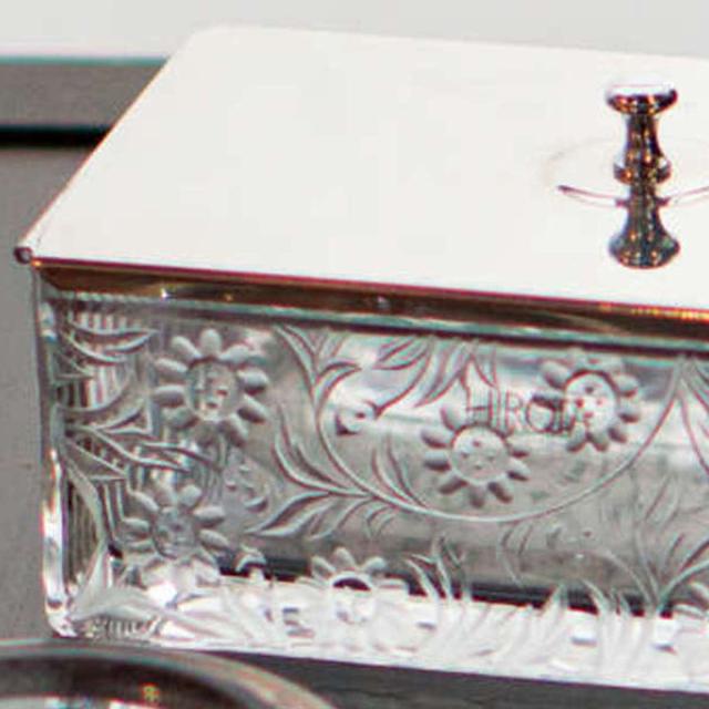 側面には繊細な彫刻でお花の柄が施されており、まるでレースのようなデザインが美しいバターケースです。ガラスはしっかりとした厚みがあり、高級感を感じられます。市販の約200gのバターが入ります。