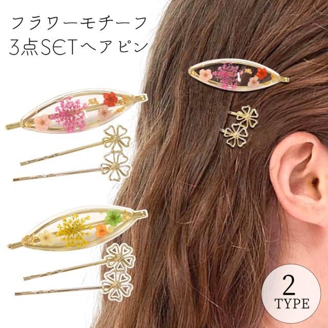ヘアピン ヘアクリップ 3点セット 3本セット ミニ ヘアアクセサリー 花柄 フラワー 押し花 レディース アメピン おしゃれ かわいい コンビ 前髪クリップ 髪留め 髪飾り (hak762)