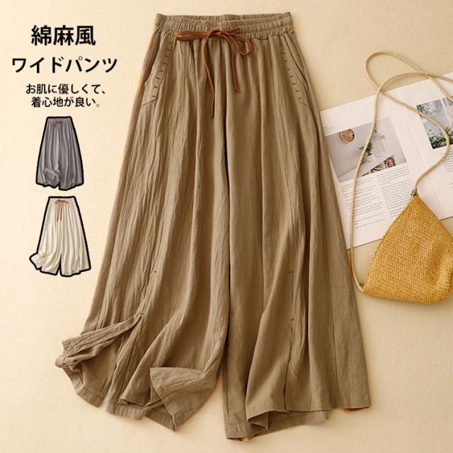 ワイドパンツ レディース 夏 ガウチョパンツ 大きいサイズ 綿麻風 スリット パンツ 涼しい ボトムス ウエストゴム ガウチョ イージーパンツ ワイド ポケット 体型カバー ゆったり ルームウエア 涼