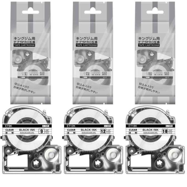 【テープセット】: テプラ テープ 透明 ST9K ST12K ST18K の互換品、3個セット。【汎用サイズ】: 9mm + 12mm + 18mm * 8m 。【色】: 透明地黒文字