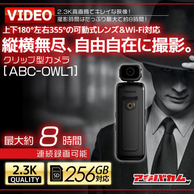 アキバカムオリジナル 上下180°/左右355° 可動式レンズ Wi-Fi対応 2.3K高画質 赤外線暗視 クリップ型カメラ ABC-OWL1