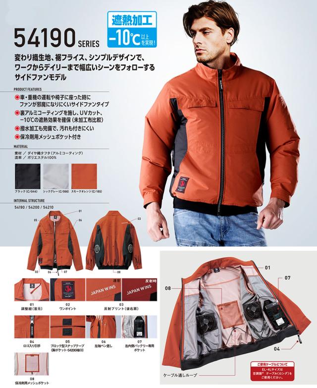遮熱加工-10℃以上、サイドファン、首元調整紐、反射プリント(後右肩)、ロゴ入り引き手、ブロック型スナップテープ(胸ポケット)、左内側バッテリー専用ポケット、保冷剤用メッシュポケット