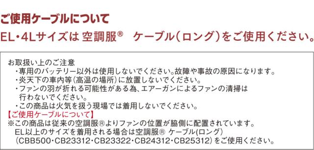 EL以上のサイズを着用される場合は空調服ケーブル(ロング)をご使用ください。