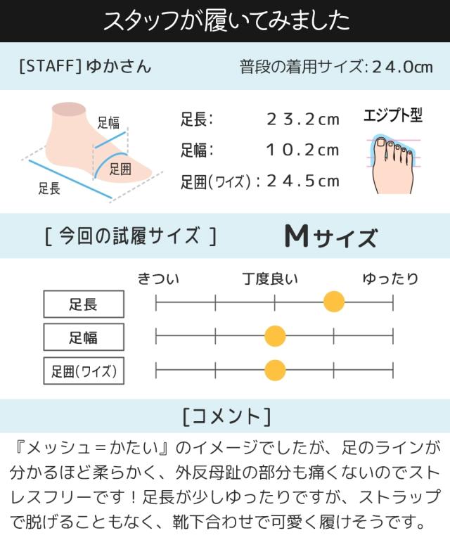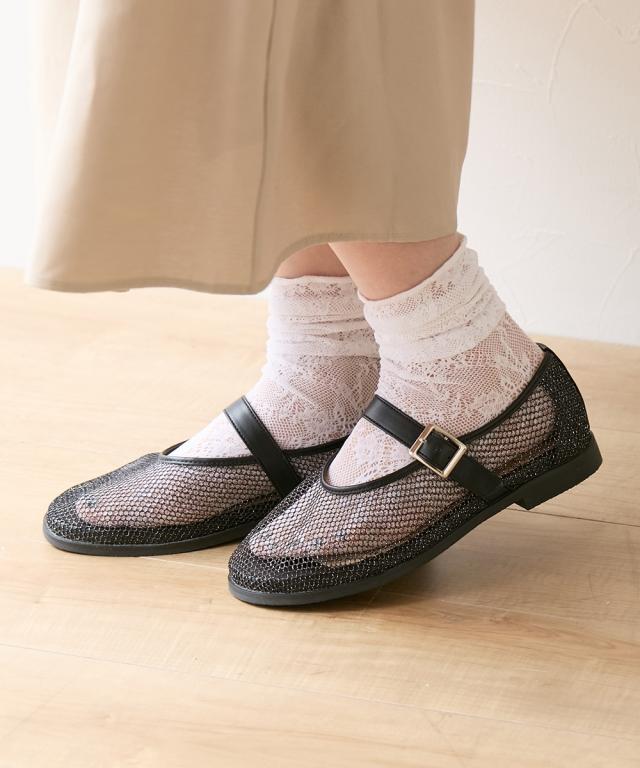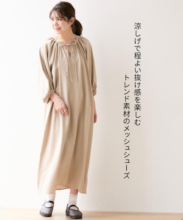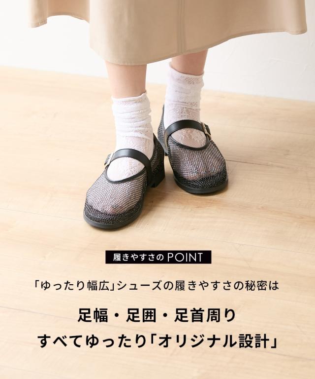 透け感のあるメッシュ素材がトレンド感たっぷりシューズ。丸めのラウンドトゥに、コロンと大ぶりなバックルでモード感をプラス。デニムに合わせてカジュアルに、きれいめパンツやワンピースでフェミニンにも。素足はもちろん、ソックス合わせのコーディネートもオススメです。 ■ポイント ・メッシュ部分はきらっと光るラメ素材 ・ストラップ内側はゴム仕様で脱ぎ履きラク ・足あたりがやわらかいメッシュ素材 ・低反発クッションで足への痛みや疲れを軽減 ・カジュアルにもフェミニンにも合わせやすい ・靴下合わせもかわいいので、シーズン長く履きまわせて 【ニッセンオリジナルの大きいサイズ規格】 本当に合う靴に出会った事はありますか ニッセンの4Eは、靴底の幅を広げ、甲や足首周りもゆったりの独自設計。 靴のサイズにお悩みのお客様へ向けて、サイズが大きくてもバランス良くきれいに見えるよう企画したオリジナルシューズです。