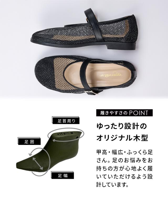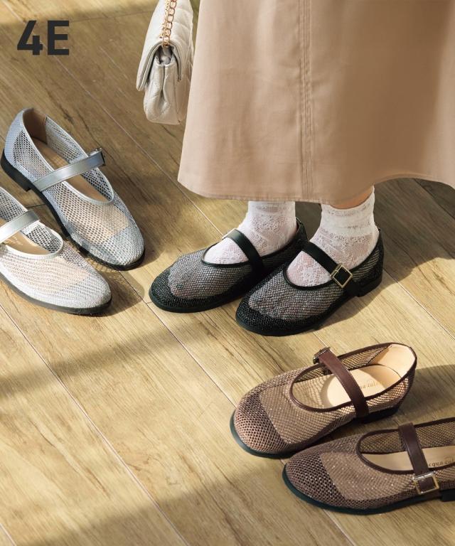 透け感のあるメッシュ素材がトレンド感たっぷりシューズ。丸めのラウンドトゥに、コロンと大ぶりなバックルでモード感をプラス。デニムに合わせてカジュアルに、きれいめパンツやワンピースでフェミニンにも。素足はもちろん、ソックス合わせのコーディネートもオススメです。 ■ポイント ・メッシュ部分はきらっと光るラメ素材 ・ストラップ内側はゴム仕様で脱ぎ履きラク ・足あたりがやわらかいメッシュ素材 ・低反発クッションで足への痛みや疲れを軽減 ・カジュアルにもフェミニンにも合わせやすい ・靴下合わせもかわいいので、シーズン長く履きまわせて 【ニッセンオリジナルの大きいサイズ規格】 本当に合う靴に出会った事はありますか ニッセンの4Eは、靴底の幅を広げ、甲や足首周りもゆったりの独自設計。 靴のサイズにお悩みのお客様へ向けて、サイズが大きくてもバランス良くきれいに見えるよう企画したオリジナルシューズです。