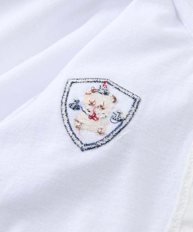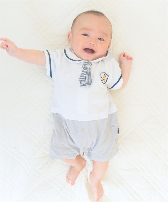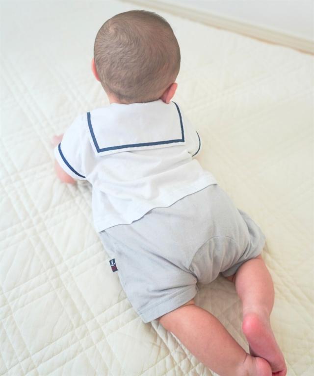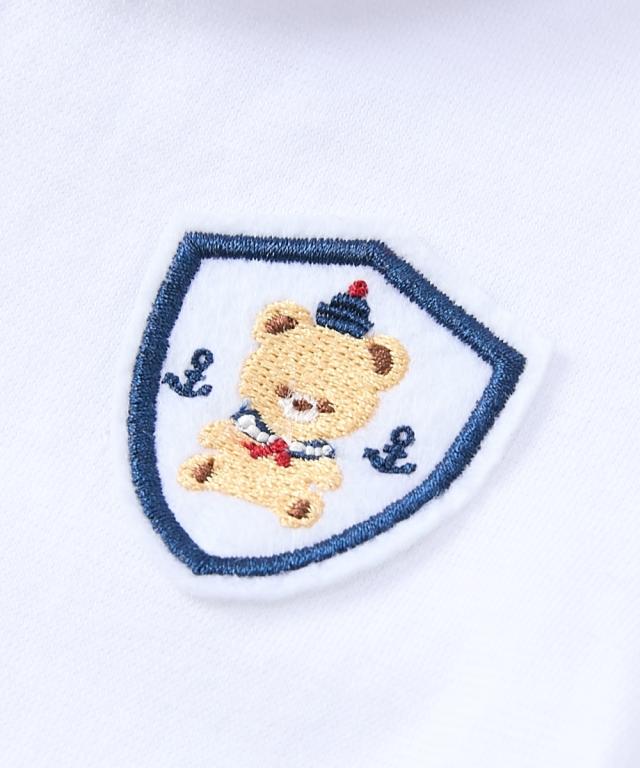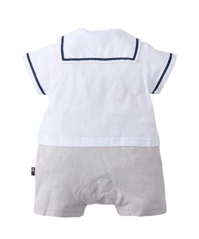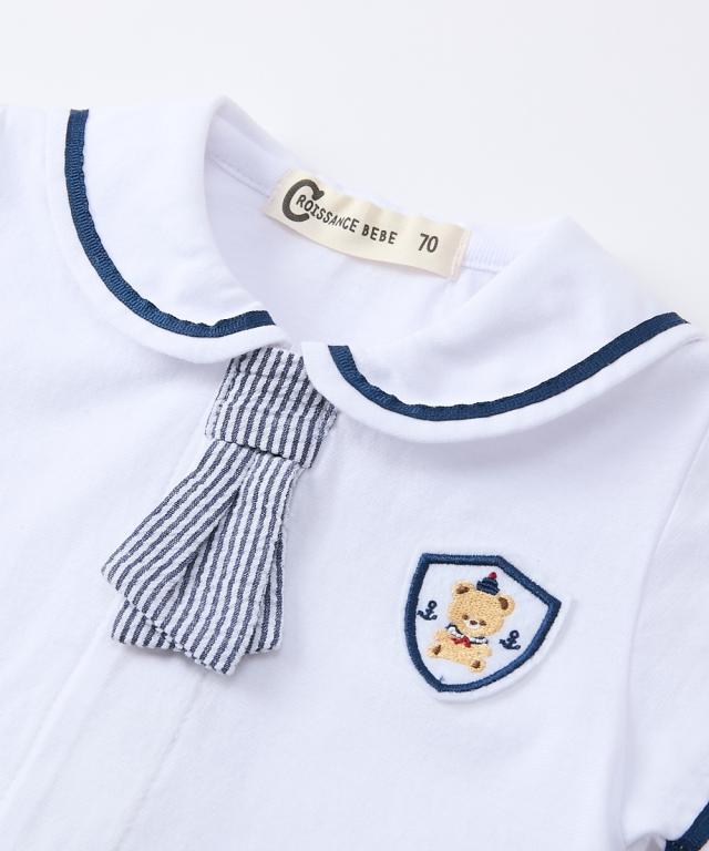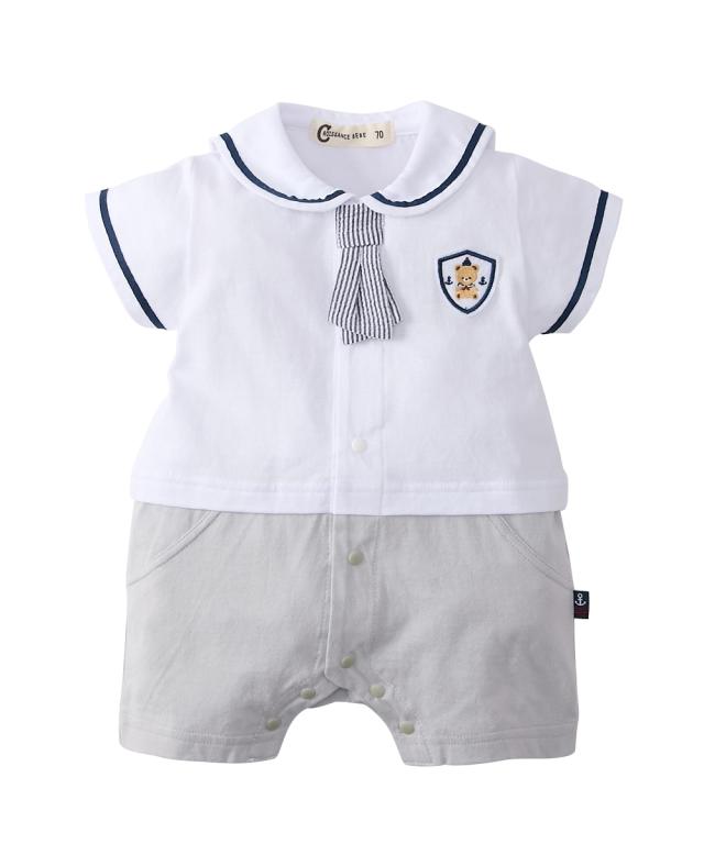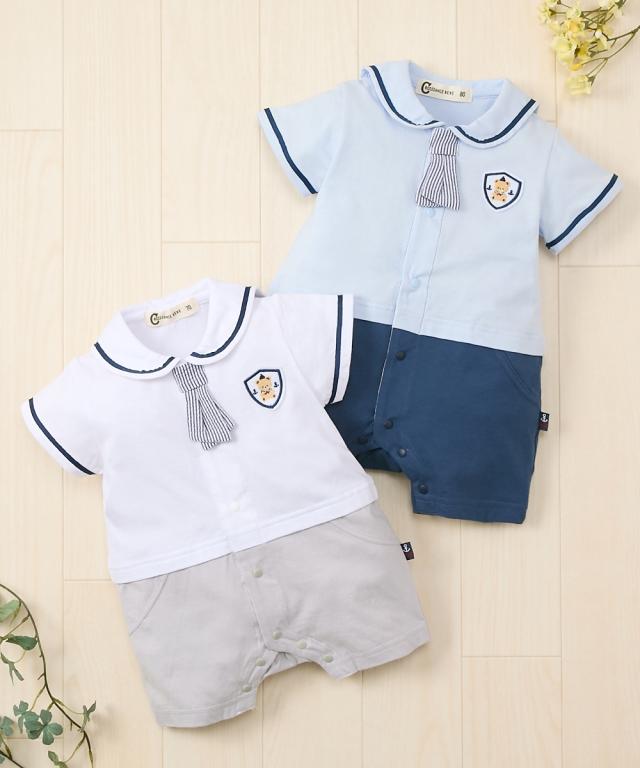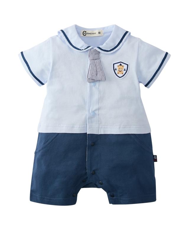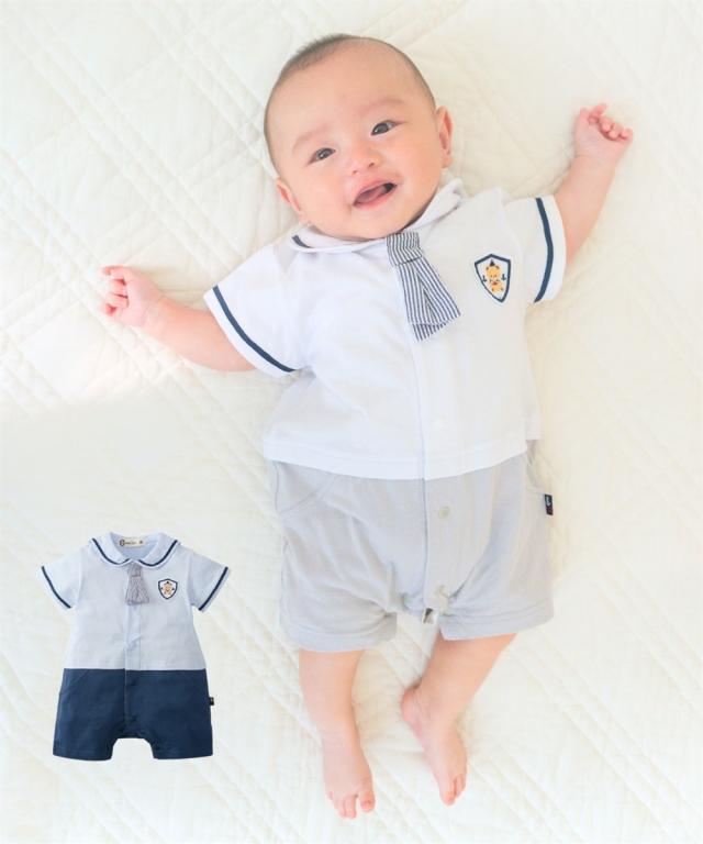 かわいいセーラー衿の半袖カバーオールです。 ■design ・セーラー衿+ネクタイでフォーマル感のあるデザイン。 お出かけ着としても、普段使いにもおすすめです。 ・ボトムを合わせたような、夏らしい爽やかなカラーの切替デザイン ・左胸にはかわいいくまのワッペン付き ■point ・赤ちゃんの肌にやさしい、綿100%の天竺素材を使用。 ・お着替えやおむつ替えも簡単な前開きスナップボタン式。 ・出産祝いやギフトにも喜ばれるアイテムです。