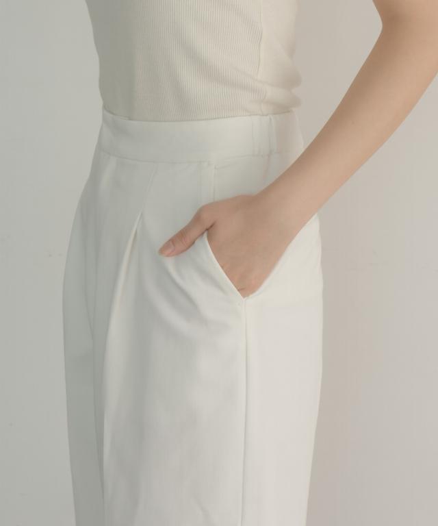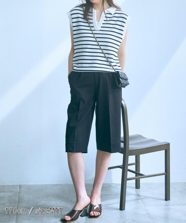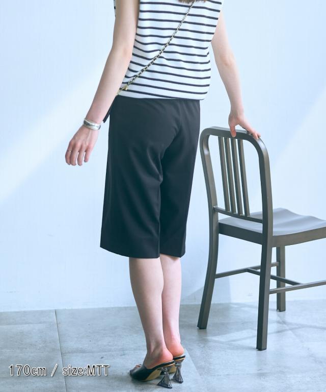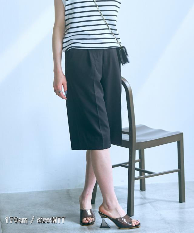 【高身長な方向け】カジュアルすぎないオトナ女子が綺麗に履けるハーフパンツ ■デザイン ・ひざ下が隠れる丈感でオトナも上品に着れるシルエットに。・フロントタック&センタープレスデザインで立体感を演出。・オフホワイトのみ裏地付き。透けの心配なくご着用いただけます。 POINT・裾部分折り返し布の長さを通常のボトムより多めにとっております。 お好みの丈感にお直しが可能です。 ■素材 ・程よくハリ感があり上品でスラックスのような布帛素材。・シルエットを拾わずすっきりとご着用いただけます。 ■おすすめのスタイリング カジュアルなTシャツと合わせてもきれいめにまとまりまるのがポイント。ハーフパンツを着ると子供っぽくなってしまう・・・そんな方にもチャレンジしていただきたい!また、シャツやブラウスとのコーディネートも相性抜群です。シアー感のあるアイテムと合わせるとより夏らしいスタイリングが叶います。足元はヒールのあるアイテムはもちろん、トレンドの厚底サンダルで外してもとっても可愛いです