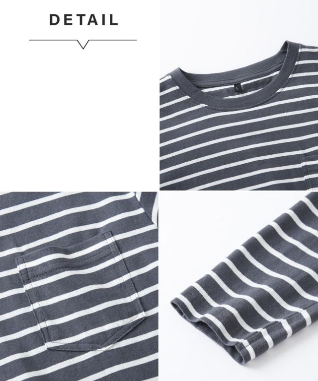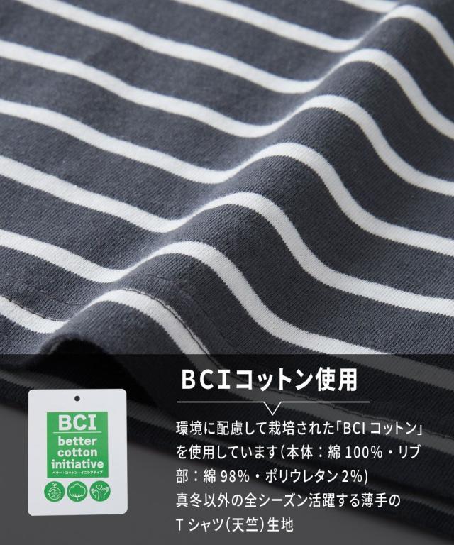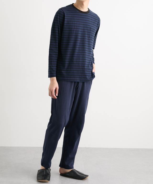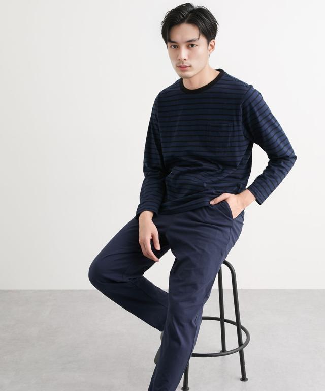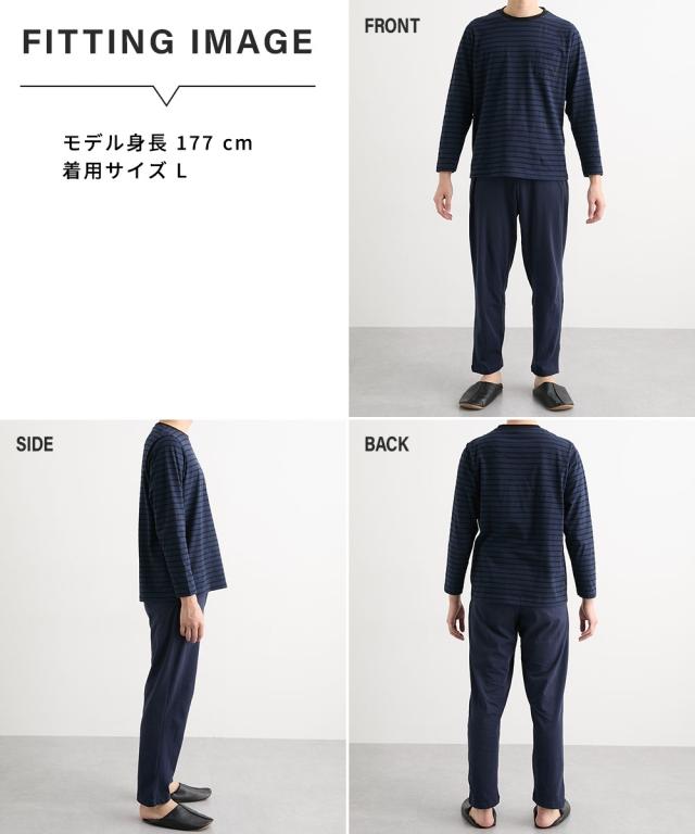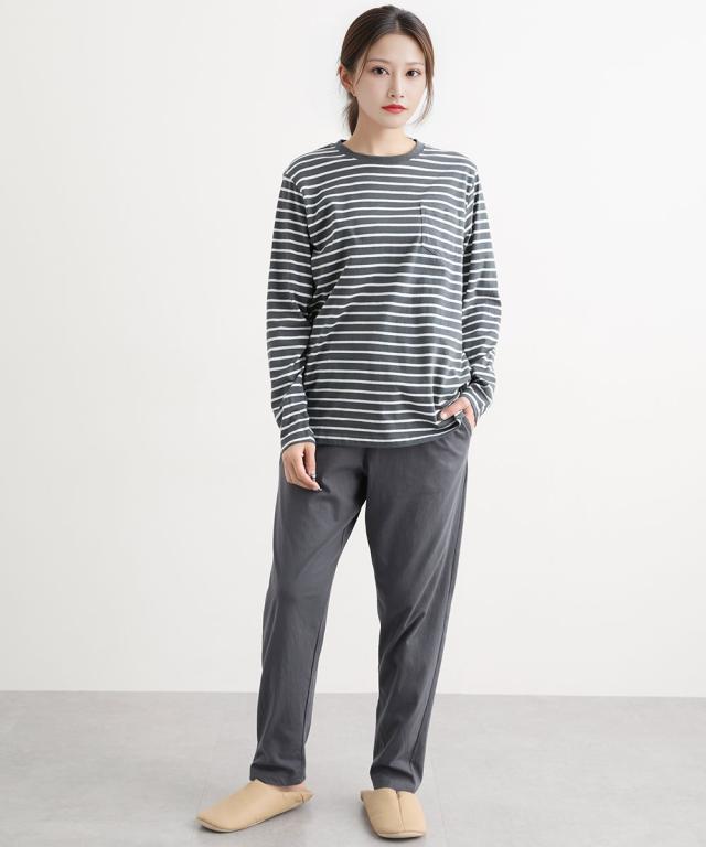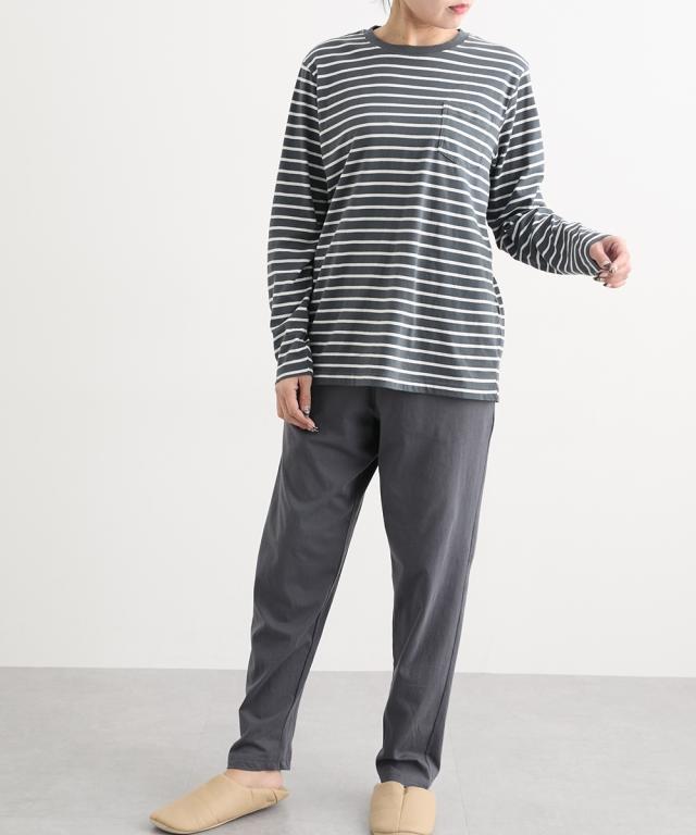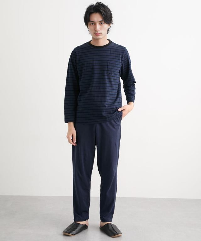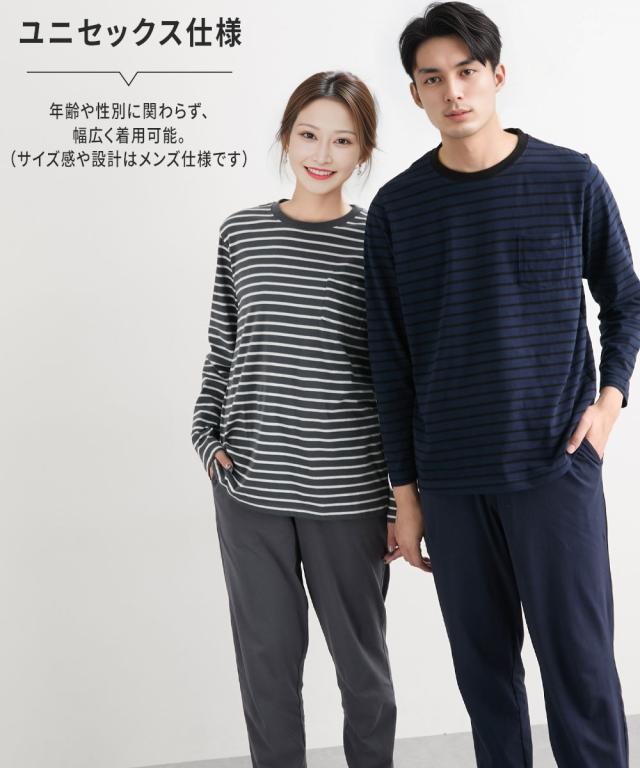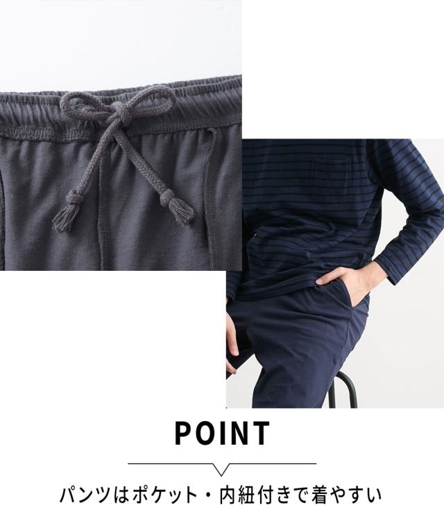 本体は綿100%を使用した、薄手で着やすいルームウェア。(リブ部分は綿98%・ ポリウレタン2%使用) Tシャツなどによく使われる「天竺」素材なので、春や秋はもちろん、冷房の効いた部屋なら夏でも、暖房の効いた部屋なら冬でも活躍します。 環境に配慮して栽培された「BCIコットン」を使用しています(※) パンツは両サイドポケット付きで、さらにトップスにも胸ポケットが付いているので、使いやすいです。 ウエストは内紐付きなのでサイズ調整しやすく、快適な着心地。 シンプルなデザインなので、年齢や性別に関わらず、幅広く着用頂けます。 同素材の無地上下セットも販売しています。 ※BCIコットンについて サステイナブルなコットンの生産を目指すNGO「ベターコットンイニシアティブ(BCI)」の認証を受けて栽培されたコットンを使用しています。 適切な水や農薬のしよう基準を満たす、環境に配慮したより良い栽培方法で生産されたコットンです。 ■デザイン パンツの両サイドにはポケットが付いているので便利。トップスはボーダー柄で、ユニセックスでも着用しやすいデザインです。 ■素材 Tシャツなどによく使われる「天竺」素材を使用しています。薄手で年中活躍します。 ■