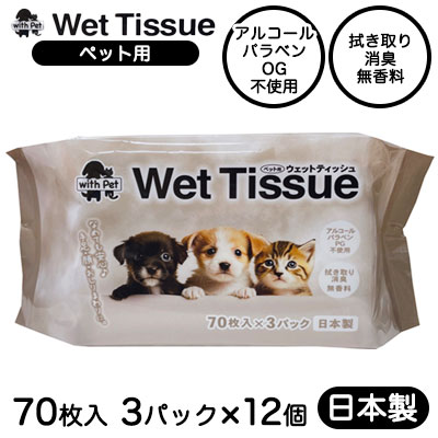 ● 昭和紙工 ペット用 ウェットティッシュ 70枚入×3パック×12個 Wet Tissue 日本製 ウエット ノンアルコール 送料無料 03071