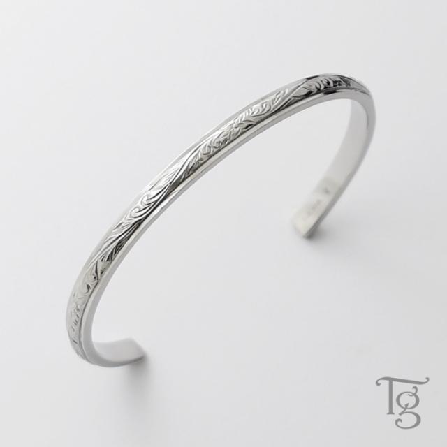 プルメリアとスクロール柄がデザインされたハワイアンバングル。シンプルな単色のシルバーカラーになっております。