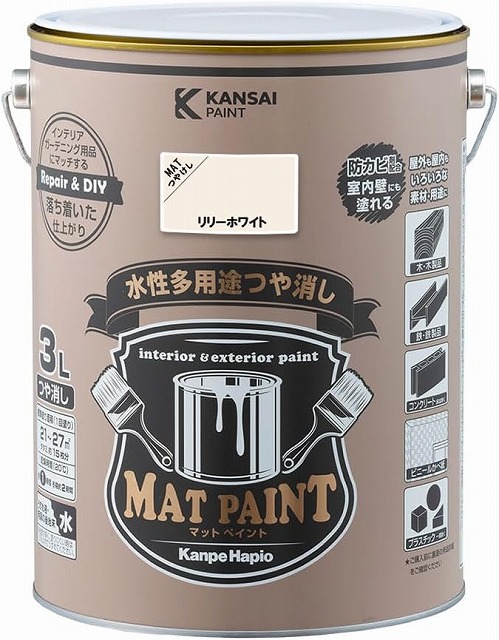 カンペハピオ 水性多用途つや消し マットペイント リリーホワイト 3L ペンキ DIY