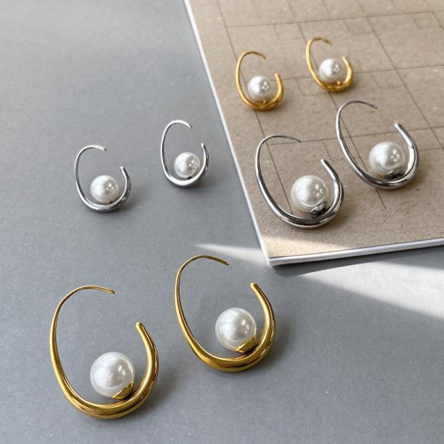 シンプルで清楚な印象のパール付ドロップフープピアス。