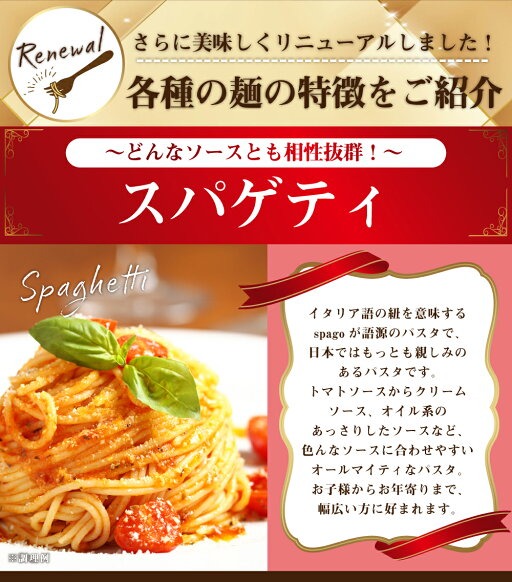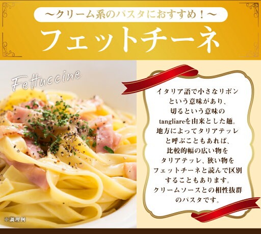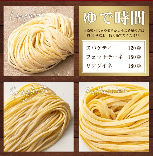 | ・フェットチーネ(120g)×6袋 ・リングイネ(120g)×6袋 ・スパゲッティ(120g)×6袋 ・ミックス6袋(フェットチーネ(120g)×2袋+リングイネ(120g)×2袋+スパゲティ(120g)×2袋) ※こちらはパスタのみのセットになります。 |