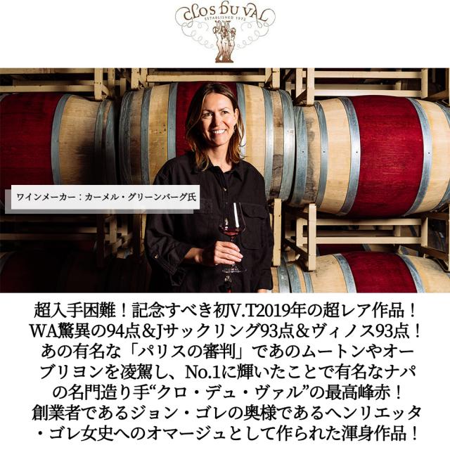 超入手困難!記念すべき初V.T2019年の超レア作品!WA驚異の94点&Jサックリング93点&ヴィノス93点!あの有名な「パリスの審判」であのムートンやオーブリヨンを凌駕し、No.1に輝いたことで有名なナパ の名門造り手“クロ・デュ・ヴァル”の最高峰赤!創業者であるジョン・ゴレの奥様であるへンリエッタ・ゴレ女史へのオマージュとして作られた渾身作品!