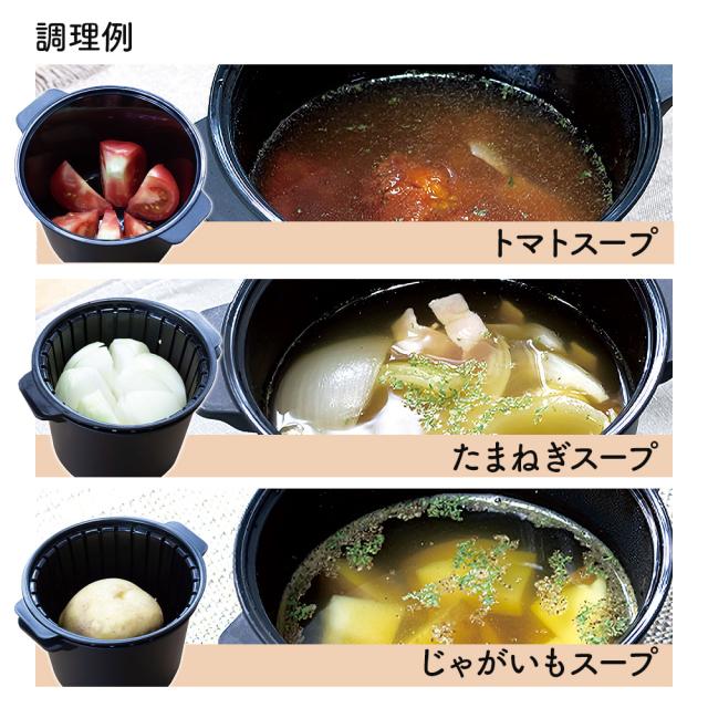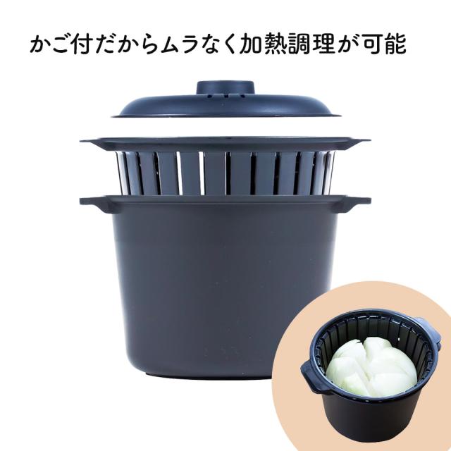 カゴ付きで様々な野菜スープが作れるかご付だからムラなく加熱調理が可能。