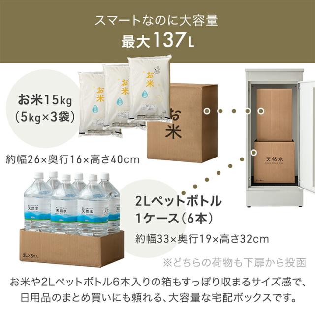- 結構、通販を利用します。ペットボトルなどを箱で頼むと、小さめのボックスだとすぐに埋まってしまい、他の配送や、家族のものが入らなくなります。 少し価格高めですが、下の扉をロックしても2回目以降を上から入れ、なおかつ、ボックス容量を活かせるのは、この押し込み式のみです。上から入れられても、仕切り板タイプだと、上蓋との連動で仕切り板が動くため、箱の大きさが意外に活かせない為です。