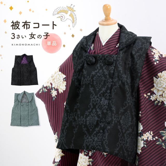 七五三 着物 3歳 女の子 被布コート 単品 アラベスク ブラック ブルーグレー 中綿入り KIMONOMACHI オリジナル 女の子用被布コート 3才 女児用 三歳被布コート