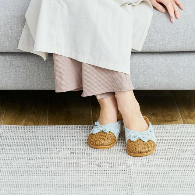 涼しげな編み込み風デザインに、可愛いリボンがアクセントになったルームシューズが、足元を軽やかに彩ります。通気性の良い構造で、蒸れにくく、快適な履き心地です。