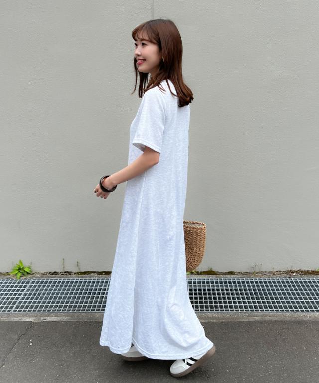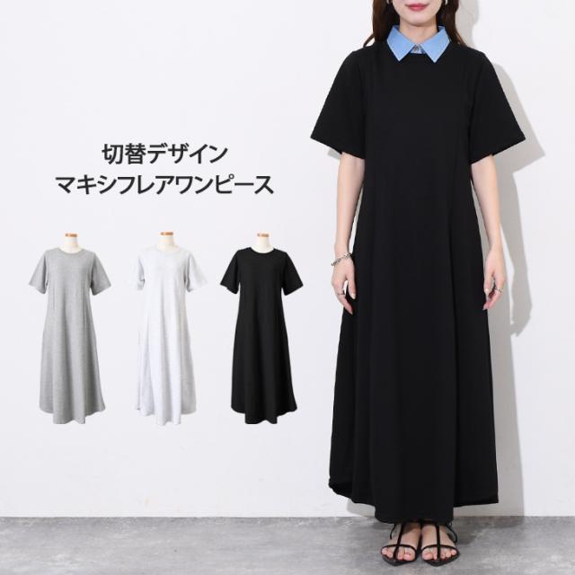 新作 切替デザインラウンドヘムライトスウェットマキシフレアワンピース レディース 春 夏 半袖 ロング丈 マキシ丈 Aライン おしゃれ きれいめ カジュアル 可愛い 膝下 ライトスエット シンプル 細見え 着痩せ