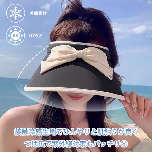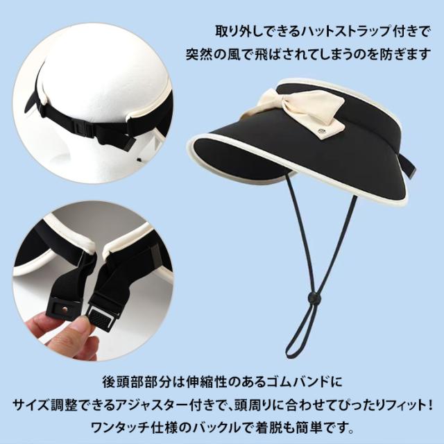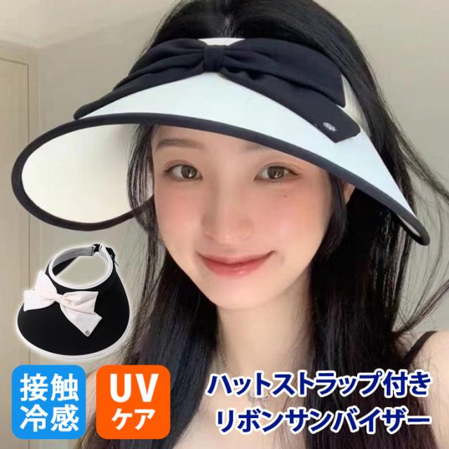 新作 UVケア接触冷感ハットストラップ付きリボンサンバイザー レディース サンバイザー 帽子 キャップ ハット つば広 深い 小顔効果 夏 UV 紫外線 日よけ 日焼け防止 接触冷感 ひんやり 涼しい ママ 自転車