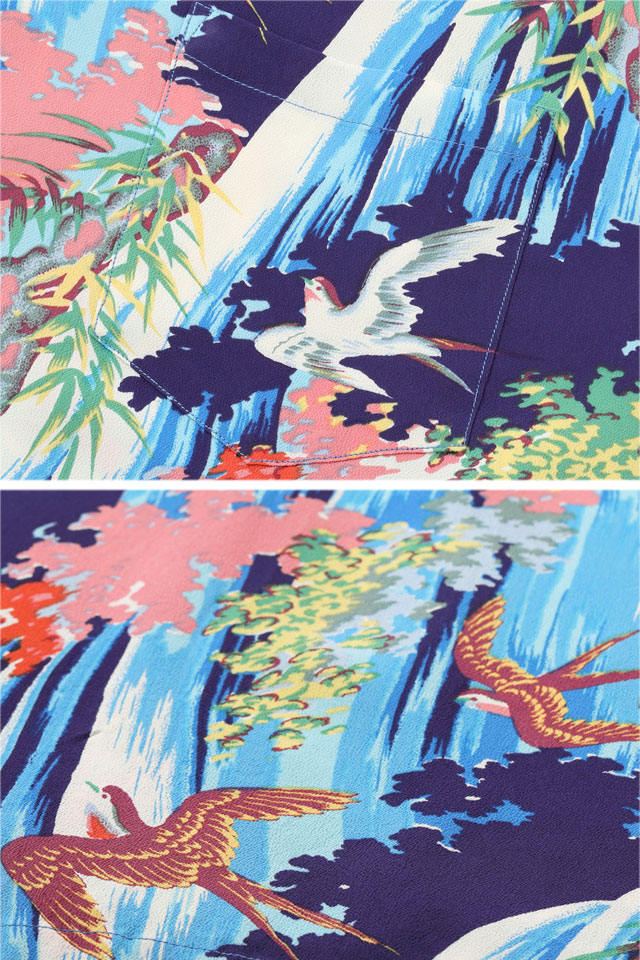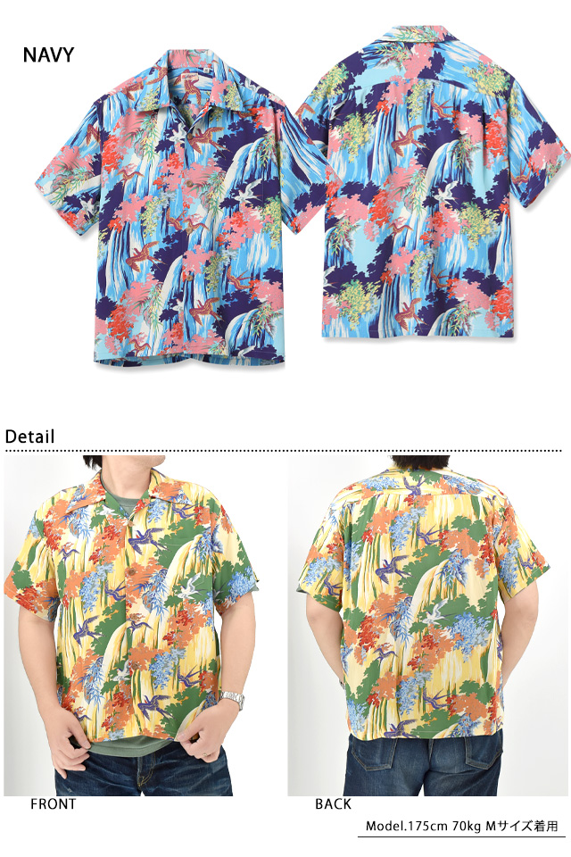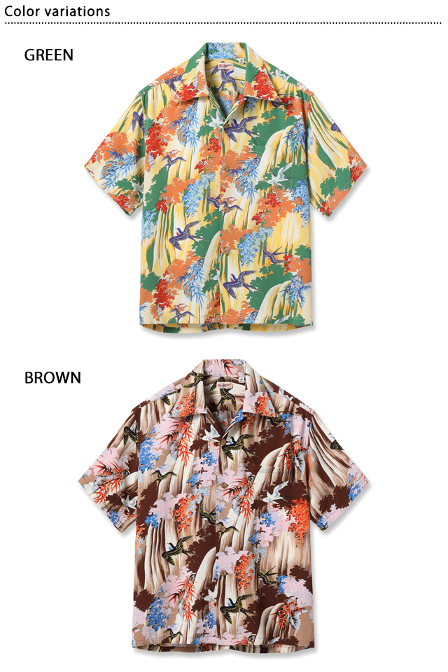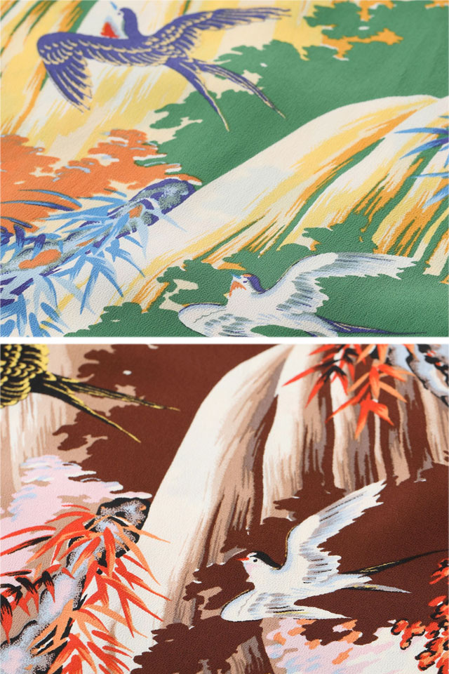アロハシャツの黄金時代とされる1930〜50年代にかけて作られた「ヴィンテージ」と呼ばれる貴重なアロハシャツを再現し、現代に蘇らせているブランド「SUN SURF」から、レーヨンアロハシャツ「SWALLOW WILDLY FLUTTERING」(SS39426)のご紹介です。 シャツ全体を絵のキャンバスに見立てて描かれているのは、大きな滝が流れ落ちる渓谷を飛び回る燕たち。 色々な方向に勢いよく飛び交っている燕たちの躍動感、そして流れる水の清涼感までもが伝わってくる完成度の高い一枚です。 手がけたのはアリー・ディストリビューターズ社のブランド「キロハナ」。 同ブランドは常に他のブランドには無い強い個性と美しい色使いを意識してデザインを製作し、地元ハワイの人々からも多大な支持を得ていました。 ボディーには、てろんとしたレーヨン生地を採用。 アロハシャツは、生産も非常に少なく、レアなアイテムとなっています。 | ||||||||||||||||||||||||||||||