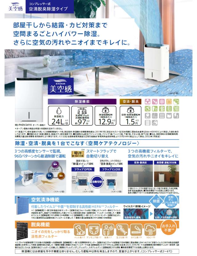MJ-PHDV24YX-W インバーター搭載 コンプレッサー式除湿機「美空間」空清脱臭除湿機