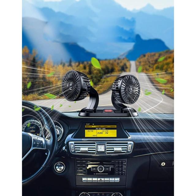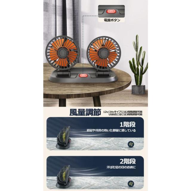 扇風機 車載扇風機 車用扇風機 車用 360度回転 5枚羽根 USB 12v/24v仕様 ダブルフ 熱対策 電動ファン 低騒音 風速風量調節可能 小型
