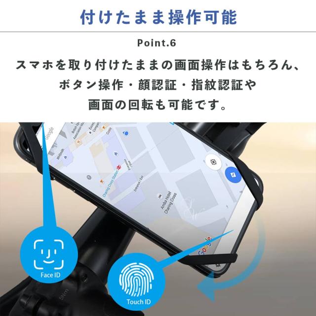 | 商品説明 | スマホをハンドルに取り付けられるスマホホルダー。 自転車やバイクなどのハンドルに取り付けることで、ナビなどをより安全に快適に使用できます。 ◆こんな時に便利 ・自転車バイクなどでの知らない道を走る時に ・サイクリングやツーリング時に ・フードデリバリーなどのお仕事時に ◆商品の特徴 ・ベルト調節で様々なハンドルに対応 ・画面が見やすい360°回転 ・しっかり固定で走行中もグラつかない安定感を実現 ・シンプルな設計で取り付け簡単 ・伸縮素材で様々な機種のスマホに対応 ・取り付けたまま操作・顔認証・指紋認証も可能 |