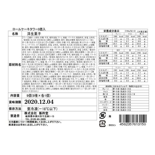 様々なシチュエーションで楽しめる小さな9種類のロールケーキセット。お好みのフルーツやクリームでデコレーションして、お召し上がりください。規格:60g×18個(プレーン 、チョコ 、黒ごま、抹茶、苺、フランボワーズ、マンゴー、マロン、紅茶 各2個)