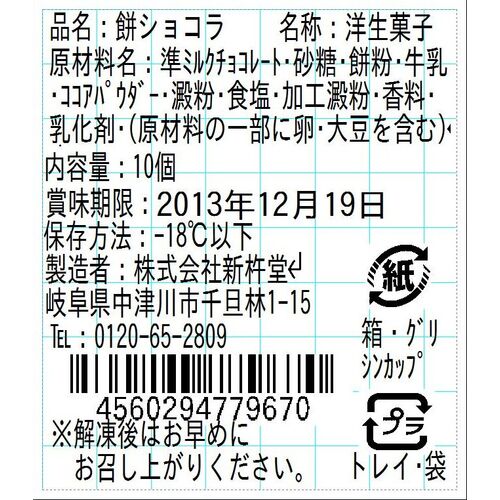 準ミルクチョコレート、砂糖、餅粉、牛乳、ココアパウダー、澱粉、食塩、加工澱粉/香料、乳化剤、(一部に乳成分・卵・大豆を含む)
