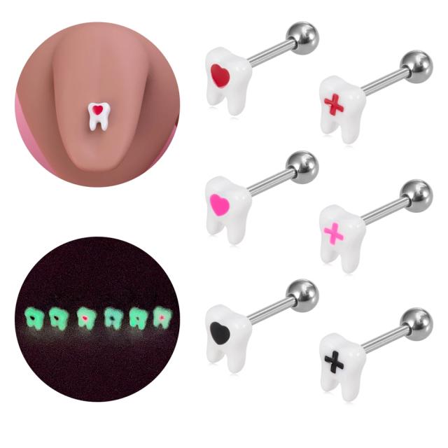 [面白い ボディピアス 14G] 歯のストレートバーベル 14ゲージ 軟骨 耳 ヘリックス 舌ピアス ベロ ボディーピアス メンズ レディース おもしろ サージカルステンレス316L ネジボール 歯科衛生士 歯医者 男の人 女の人 プレゼント ギフト ペアルック 蓄光 グロー 光る
