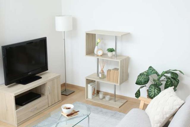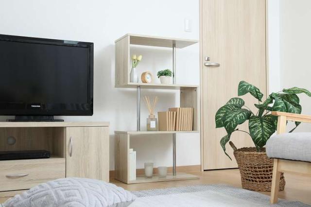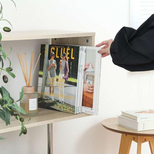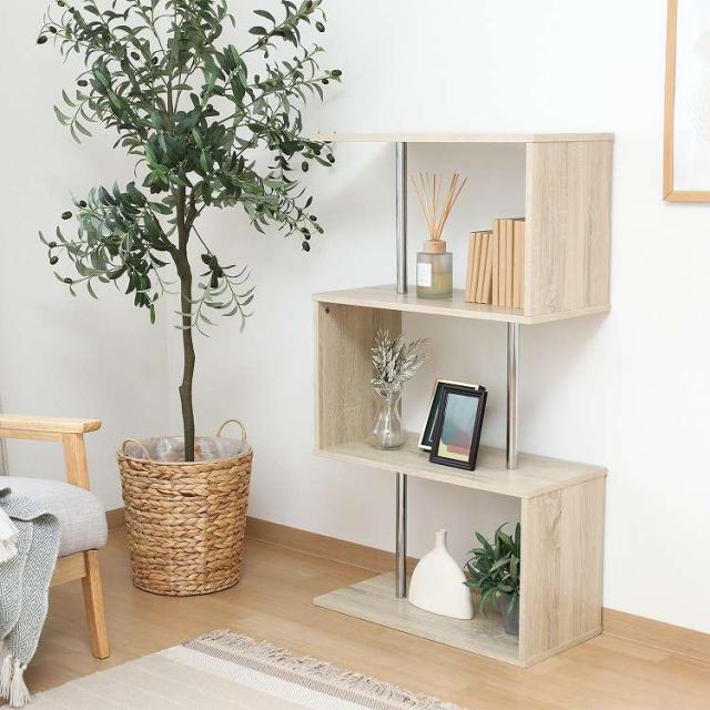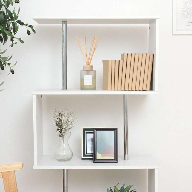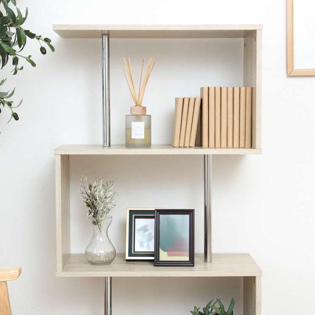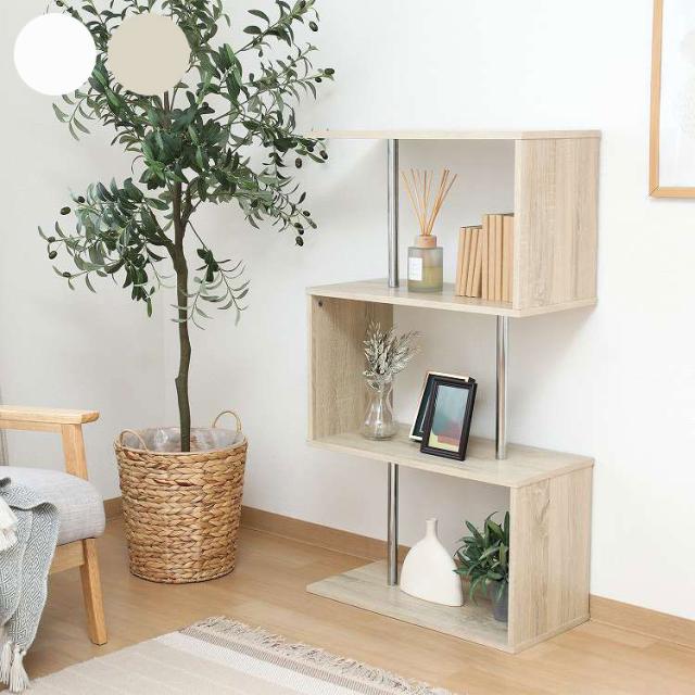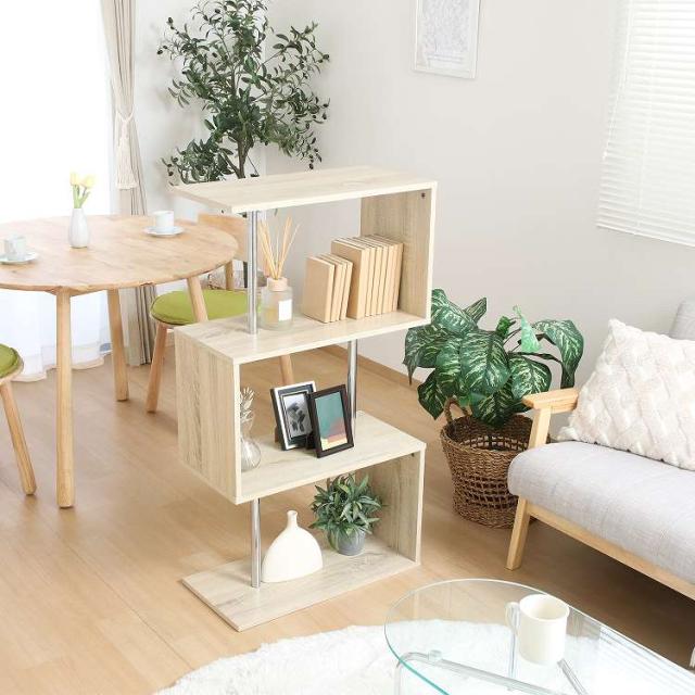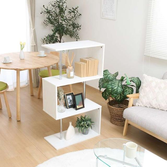 見せる収納。オシャレなS型ディスプレイラック3段見せる収納にピッタリなオープンラック。デザイン性と収納力を兼ね備えたアイテムです。ショップのディスプレイのような、置くだけで目を惹くデザイン。ディスプレイを楽しみながら収納できます。A4もすっぽり収まる高さ34cmで、ファイルや雑誌の収納にもぴったりです。背板がないので、配線を気にせず家電を置くことができます。裏側が見えてもきれいなので、間仕切りとしても使用できます。オープンデザインなのでお部屋に圧迫感を出しません。木目調と落ち着いたカラーでお部屋に馴染みます。