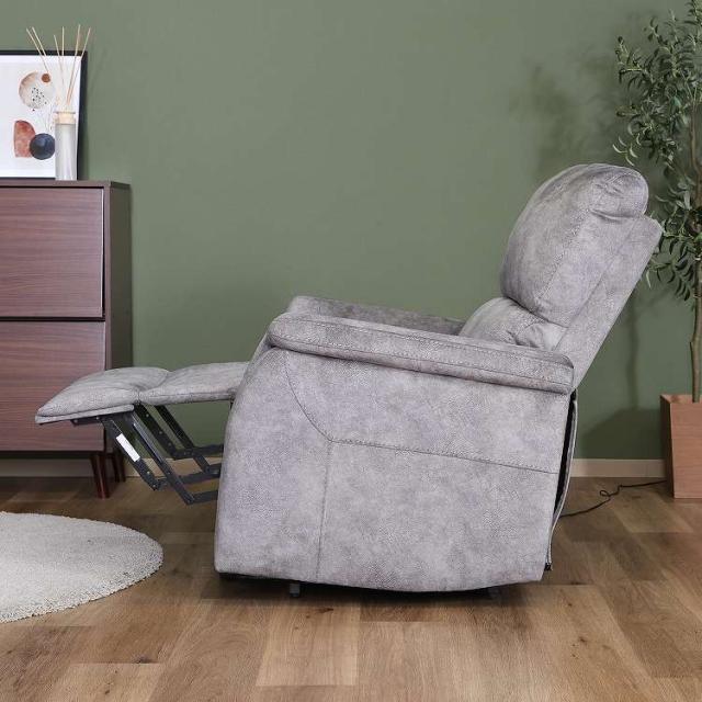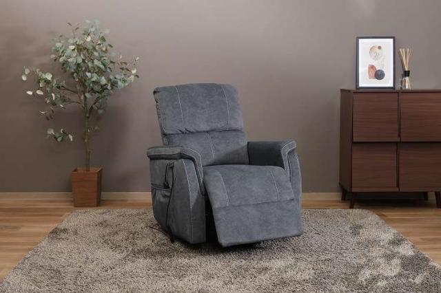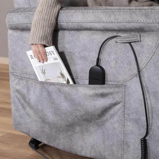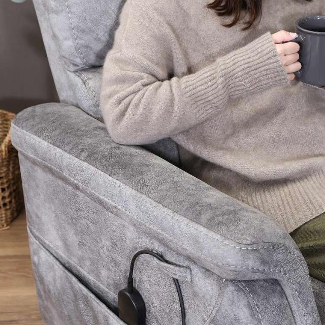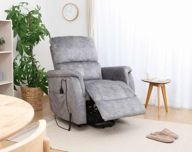 座面が上がる、傾く!立ち上がりが楽々な電動パーソナルチェア安心感のある肉厚クッションと落ち着いた色合いが、お部屋に重厚感をプラスします。座面後部が20秒で45度までせり上がり、ラクに立ち上がることができます。ゆっくりとした動作で、安全に立ち上がりをサポートしてくれます。リクライニングはフットレストも連動し、リモコンで簡単に操作できます。座面にはSバネとポケットコイルを使用しており、弾力があり長時間座っていても疲れにくく快適です。アームは幅があり、ゆったり身体を預けることができます。側面には雑誌やリモコンなどを収納できる便利なポケットが付いています。