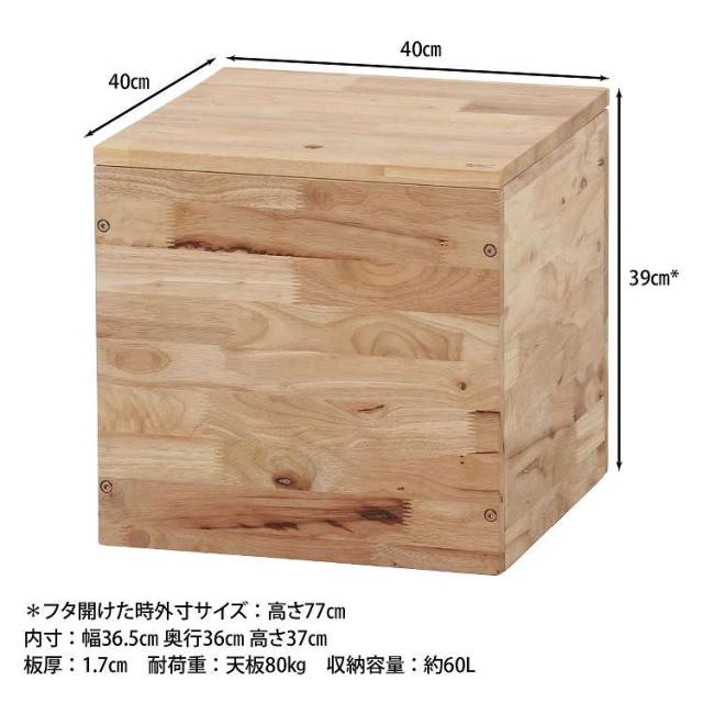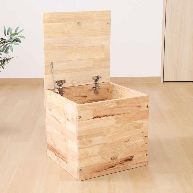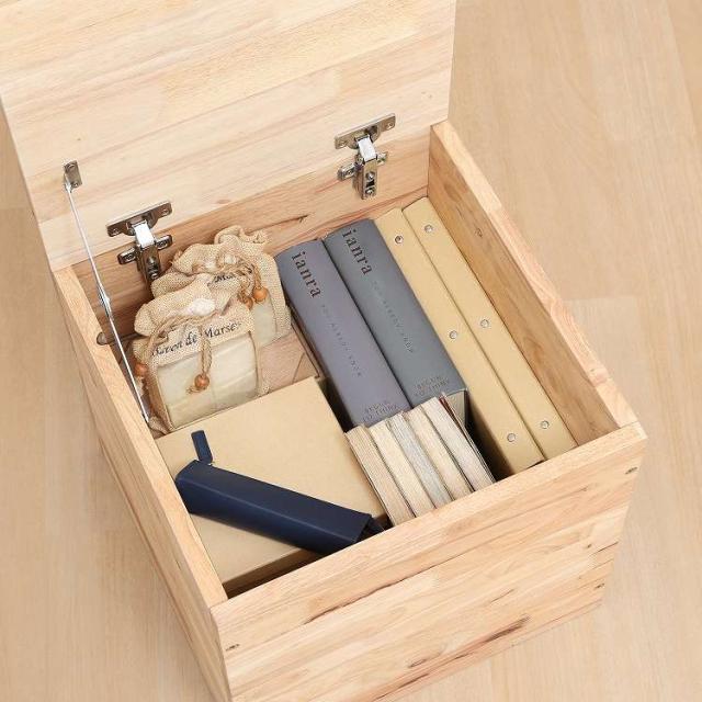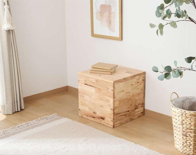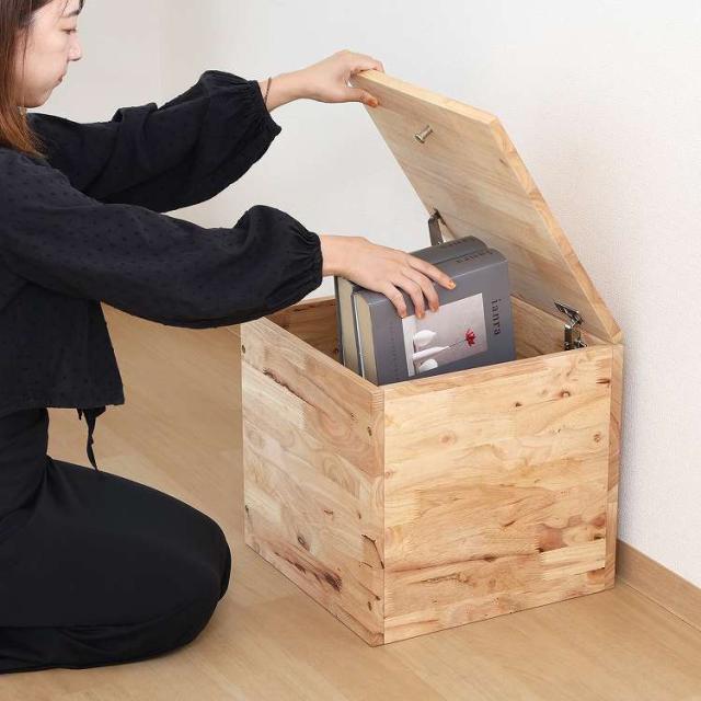 自由に組み合わせて新たな空間を作るTATAMIシリーズ 収納ボックス天然木の木目や節といった個性をそのまま活かしたデザインです。収納容量は約60L。リビング小物やブランケットなどを収納できます。蓋が大きく開くので物を出し入れしやすく、中身も一目で確認できます。蓋は付属のマグネットを使って、蓋に埋め込まれたネジを引き上げると簡単に開きます。耐荷重は80kgで大人も座れます。来客用やキッチン・玄関などの腰掛けとしても活躍。別売りのTATAMIシリーズと合わせてスキップフロアや掘りごたつなどを作ることができます。