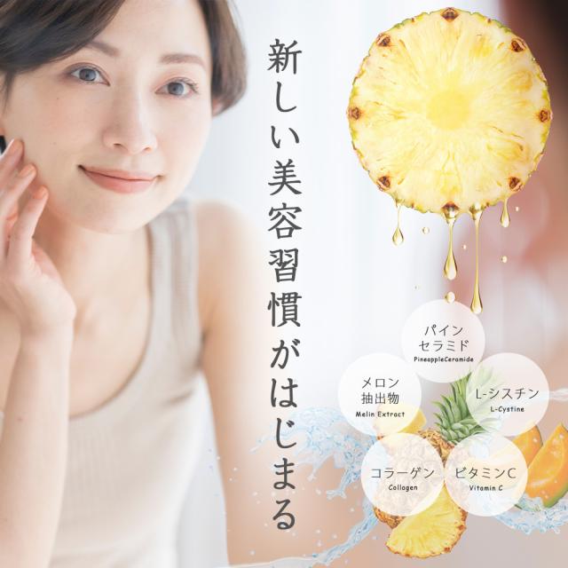 | 原材料 | パイナップル果実抽出物(セラミド含有/国内製造)、メロン抽出物(デキストリン、小麦グリアジン、メロン濃縮物)、フィッシュコラーゲンペプチド/セルロース、シクロデキストリン、L-シスチン、ビタミンC、微粒二酸化ケイ素 |