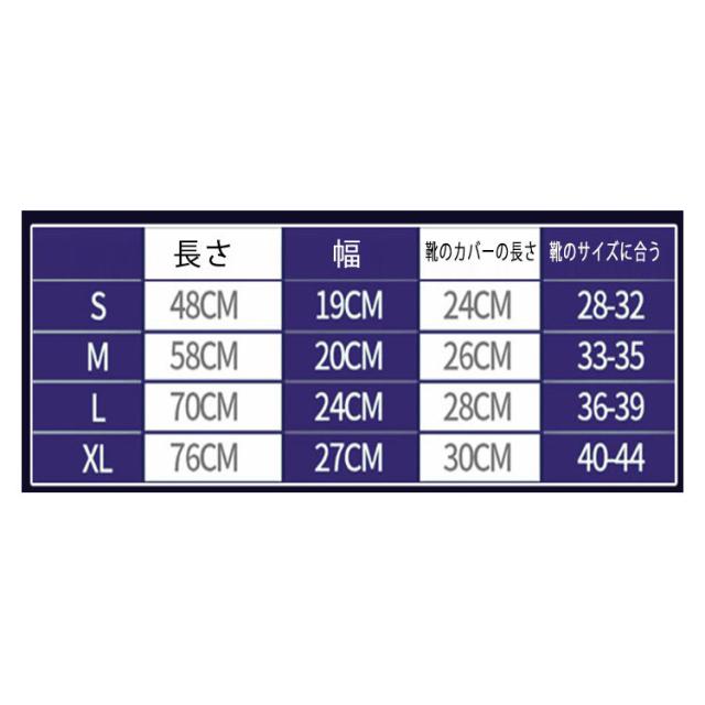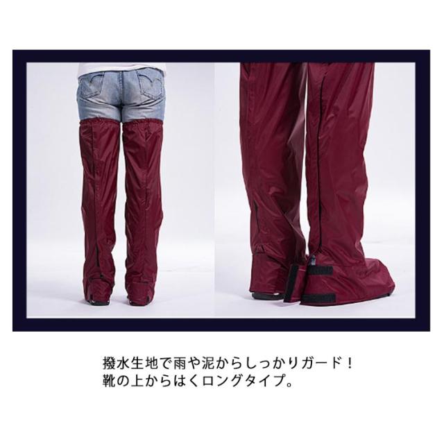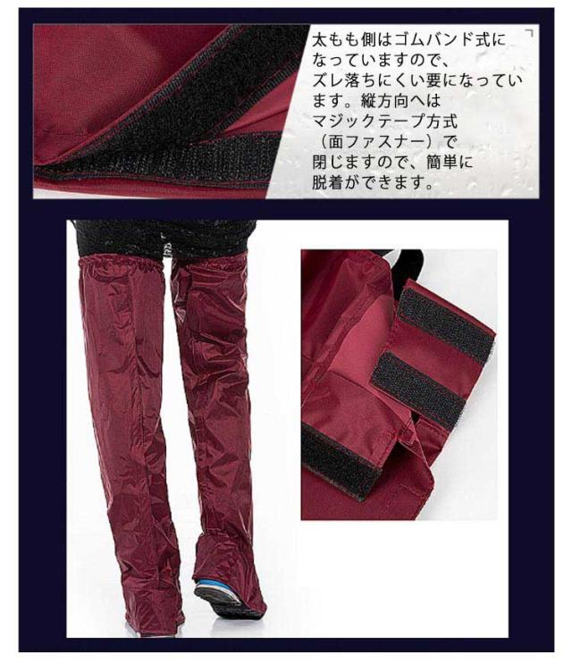 | つま先までカバーしますので長靴を履いていない場合でも雨から守ってくれます。 靴を履いたままカンタンに脱着ができる、脚だけのレインコートです。 撥水生地で雨や泥からしっかりガード!靴の上からはくロングタイプ。 オーバーパンツを履くより簡単に雨からズボンを守ります。 太もも側はゴムバンド式になっていますので、ズレ落ちにくい要になっています。縦方向へはマジックテープ方式(面ファスナー)で閉じますので、簡単に脱着ができます。 つま先部分までカバーしますので、バイク・自転車といった乗り物で威力を発揮します。 | |