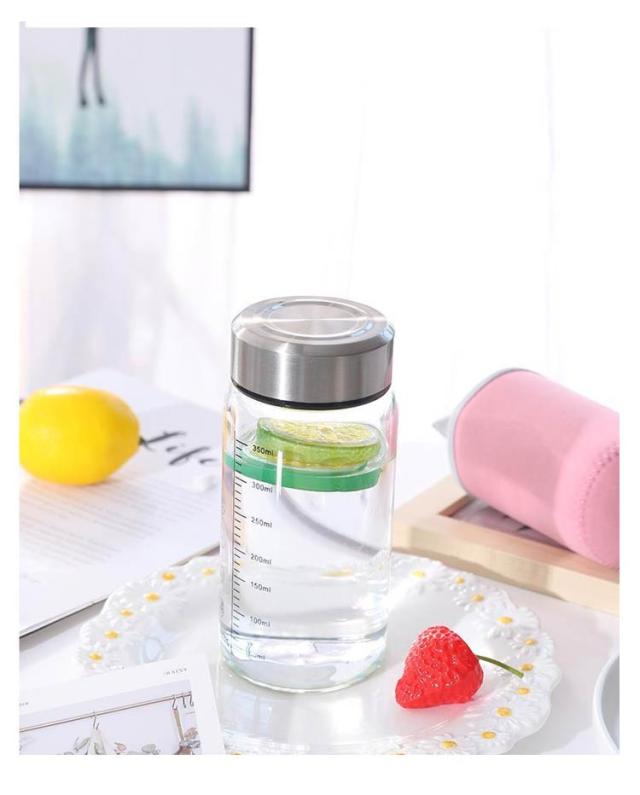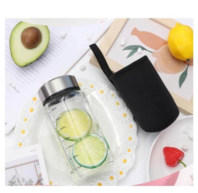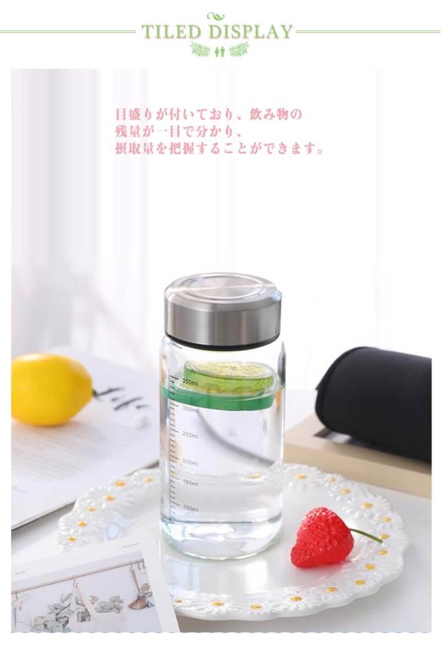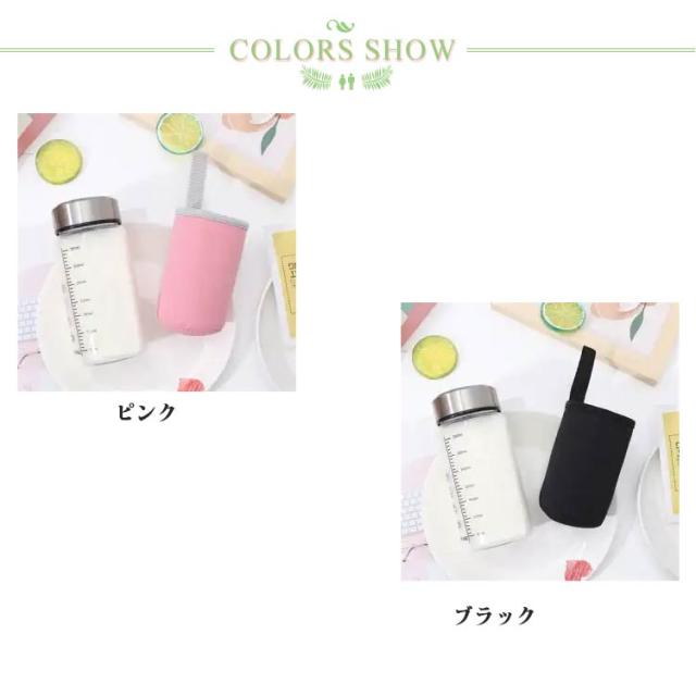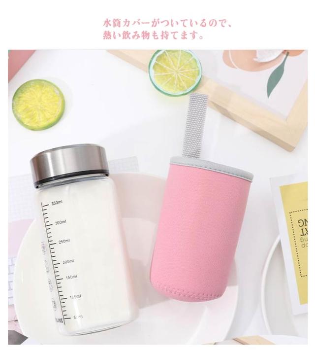 目盛り付き スポーツボトル 直飲み 超軽量 水筒 クリアボトル ウォーターボトル 耐熱 水筒 350ml ガラスボトル 携帯用 耐久性 漏れ防止 マグボトル 旅行 ジム スポーツ 水筒カバー付き 牛乳 コーヒー 飲料 電子レンジ対応