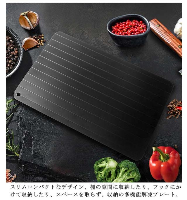 | ドリップを逃さず、食材に優しい冷凍・解凍可能♪ 航空アルミ合金は高速熱伝導性を持って、冷凍食材の冷気を吸収し、効率よく放出して、ムラなく解凍してくれる解凍プレート。 溝ありデザイン、解凍しながら、効率よく水切りできる解凍板。 解凍のほかに、冷凍時間短縮や粗熱取りにも大活躍する1台3役の解凍プレート。 水で洗うだけできれいになり、生肉などの臭いが残らず、いつもきれいにお使い頂ける。 スリムコンパクトなデザイン、棚の隙間に収納したり、フックにかけて収納したり、スペースを取らず、収納の多機能解凍プレート。 | |