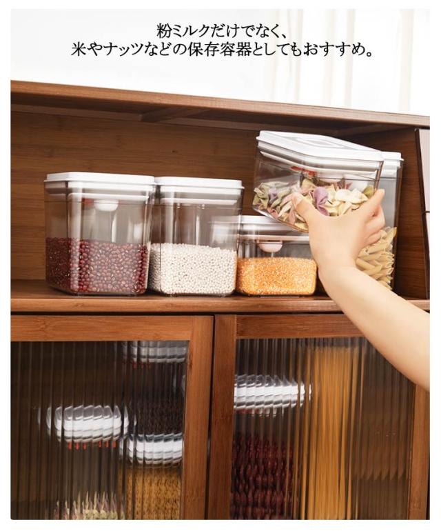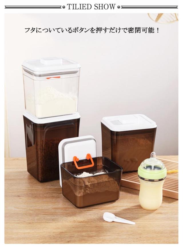 | 1000ml 1700ml 2300ml 粉ミルクやプロテインの長期保存に最適な容器 フタについているボタンを押すだけで密閉可能! 片手でワンタッチなので、料理中の手がふさがっている状況でも使いやすいのがうれしいポイント。 クリアだけでなく、茶色のデザインは遮光効果があり粉ミルクの鮮度を保てます♪ フタ部分はスプーン収納所があり、サイズ違いスプーンにも対応できます。 コンパクトなサイズ、外遊びや旅行に大変便利なアイテムです。 粉ミルクだけでなく、米やナッツなどの保存容器としてもおすすめ。 | |