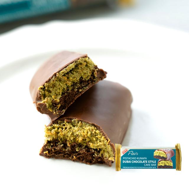 ケーキ生地に、カダイフ入りピスタチオペーストを合わせ、チョコで包みました。ドバイ製造です。