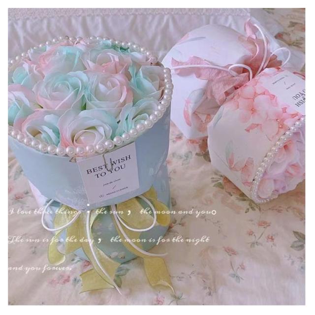 | 石鹸で作られたお花の花束です。 ソープフラワーと言えば、生花のように色鮮やかななイメージが多いですが、パステルカラーのソープフラワーブーケ、出来ました。 白を基調に柔らかいカラーのグラデーションがキュートで愛らしいブーケです。 優しいカラーの和紙とお花のまわりにはパールをあしらった清楚なブーケです。 母の日、出産のお祝いや結婚のお祝いにも喜ばれそうですね。 | |