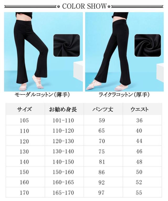 | 105〜170cm!モデール地とやや厚手のライクラ地の2タイプ! ブーツカットの美脚シルエットが特徴的なキッズダンスパンツ ストンとしたモデール地とやや厚手のライクラ地の2タイプから選んでいただけ、一年中シーズン通して使えます。 ウエストがゴム製なので着脱が簡単。股上が深めでゆったり、安心です。 ストレッチ性バツグン、ピッタリフィットで動きやすい。 計算された美フレアデザインでレッグラインを細く見せます。 女の子も男の子もOK!チームやクラブの練習着や衣装、兄弟や姉妹でお揃いもハマります。 | |