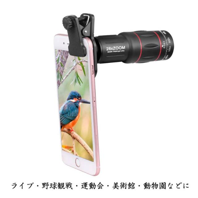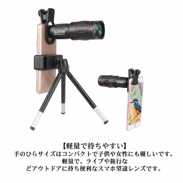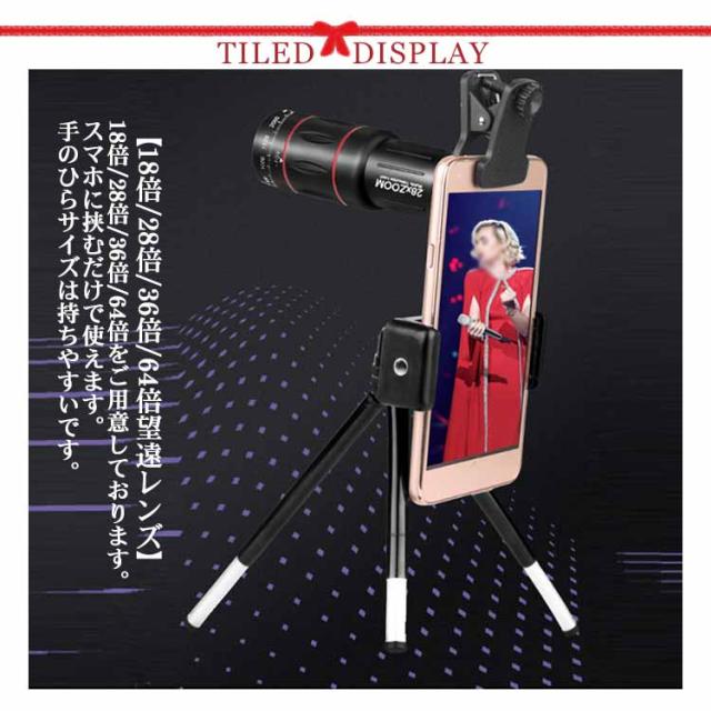 軽量 スマホ望遠レンズ 28倍 36倍 18倍 スマホに簡単装着 三脚付き 64倍 望遠鏡 単眼鏡 スマホレンズ 持ち運び 専用アイカップ コンパクト クリアで鮮明な写真撮る ライブ専用 ライブ用携帯レンズ 小型 iphone android コンサート 野球観戦 運動会 旅行