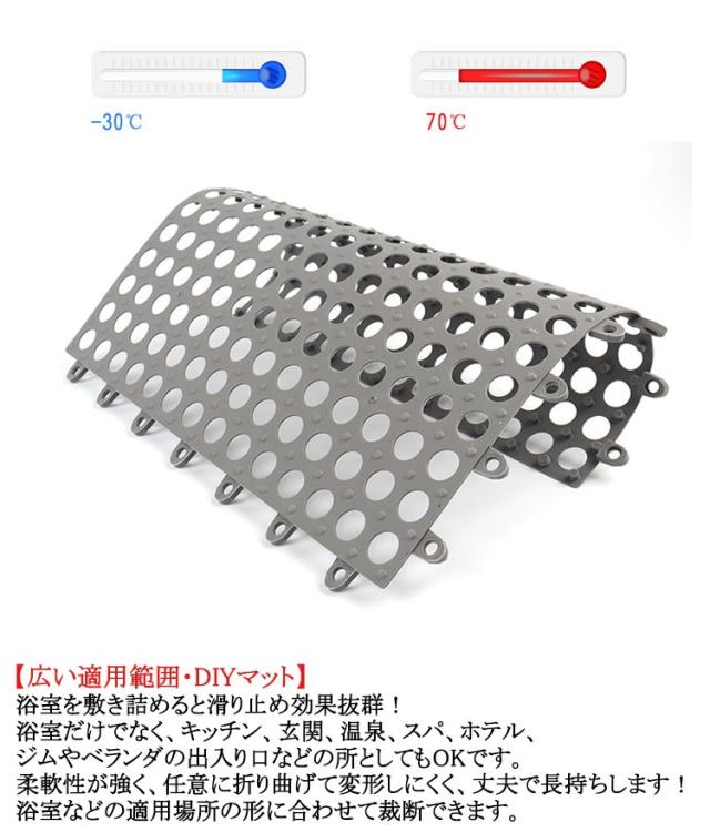 | お風呂 滑り止めマット18枚セット! 【家族の安全保護】洗い場の床や浴槽にガッチリと貼りつき、優れた滑り止め性能を発揮、ご家族の安全を守ります、お湯を張った浴槽でも安心して使えます、妊婦、高齢者やお子様の入浴に安心です。 【防カビ・防菌】穴が多くあるので水切れがよく、乾きが速いです。優れた防カビ・抗菌効果、超耐久性があり、常に清潔で安心してご利用頂けます。 【良好な排水】汚れたら洗い流すだけ!水でよく洗い、風通しの良い直射日光の当たらない場所で陰干ししてください。使わない時はクルっと巻いておけばヨシ、移動も楽ちん。 【冷たくない、防カビ】表面と裏面がすべり止め効果の高いだけでなく、お尻と足に優しです。冬でも冷たい天気でも足元は冷たくありません。 【組み立て簡単】ジョイント部分を重ねるだけ 工具不要でかんたんに組み立てる!使う場所の形状に合わせて裁断可能! 【広い適用範囲・DIYマット】浴室を敷き詰めると滑り止め効果抜群!浴室だけでなく、キッチン、玄関、温泉、スパ、ホテル、ジムやベランダの出入り口などの所としてもOKです。柔軟性が強く、任意に折り曲げて変形しにくく、丈夫で長持ちします!浴室などの適用場所の形に合わせて裁断できます。 | |